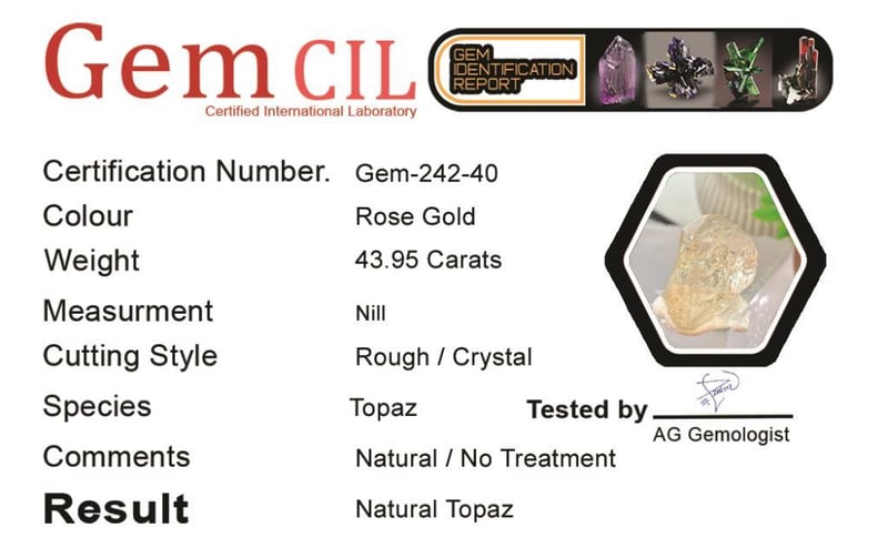 43.95 CARATS NATURALLY TERMINATED IMPERIAL ROSE GOLD TOPAZ SPECIMEN 43.95 Carats Naturally Terminated Imperial Rose Gold Topaz SpecimenStone = Natural TopazWeight = 43.95 Carats Colour = Rose Gold Cut = Naturally TerminatedLustre = Excellent Note = {Natural Termination Is Collectable}, Gem Cil, Certified Condition: Good - Refer Images 0488573+40