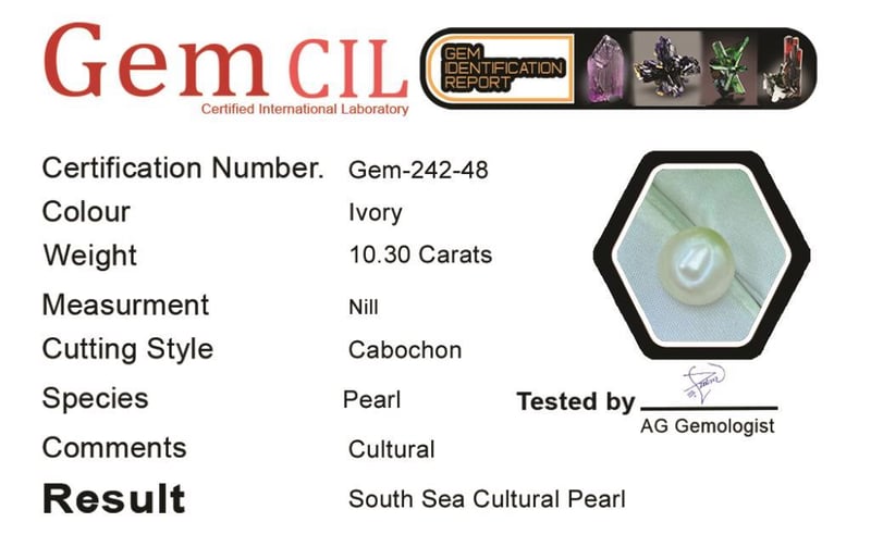10.30 CARATS SOUTH SEA PEARL 10.30 Carats South Sea Pearl Stone = South Sea Pearl Weight = 10.30 Carats Treatment = CulturalQuantity = 1Note = Gem Cil, Certified, Condition: Good - Refer Images 0488573+48
