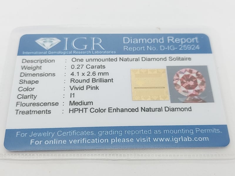 ONE UNMOUNTED NATURAL DIAMOND SOLITAIRE Vivid Pink, Hpht Color Enhanced Natural Diamond Round Brilliant Clarity I1 Total Item Weight: 0.27g Length: 0.50cm Dimensions: Height: 4.10mm, Width: 2.60mm, Depth: 1.00mm Condition: Good - Refer To Images TOORMINA 548677+1