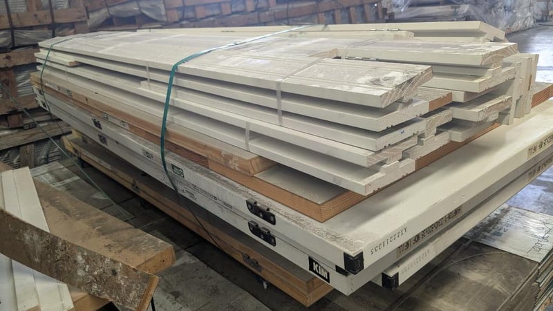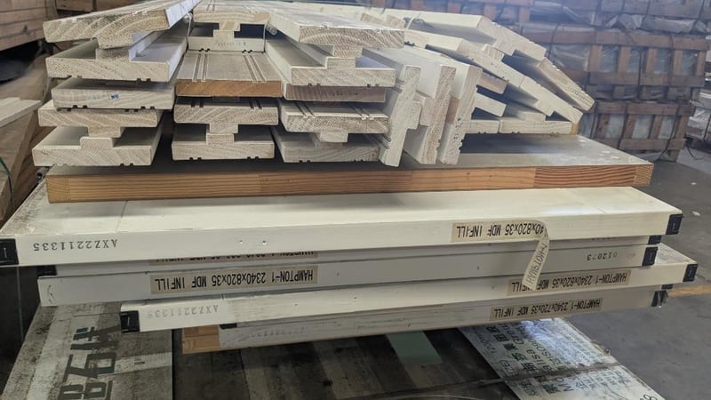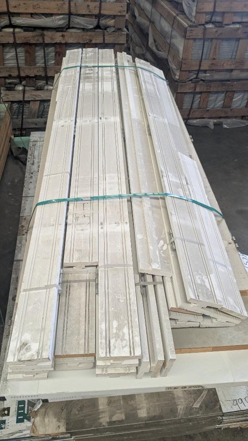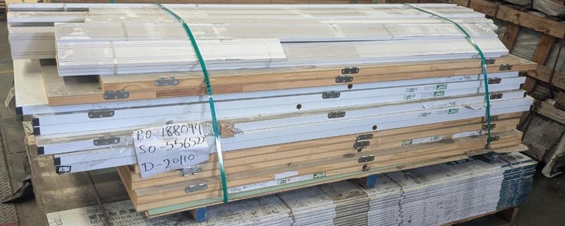 Building Supplies, Includes Primer Skirting Boards and Internal Doors, Hinges Attached Quantity to Pallet Qty; 33 Skirting: 110mm(W) x 2400mm(L) Doors: 2340mm(L) x 820mm (W) x 35mm(D) Note: Sold As Lot
