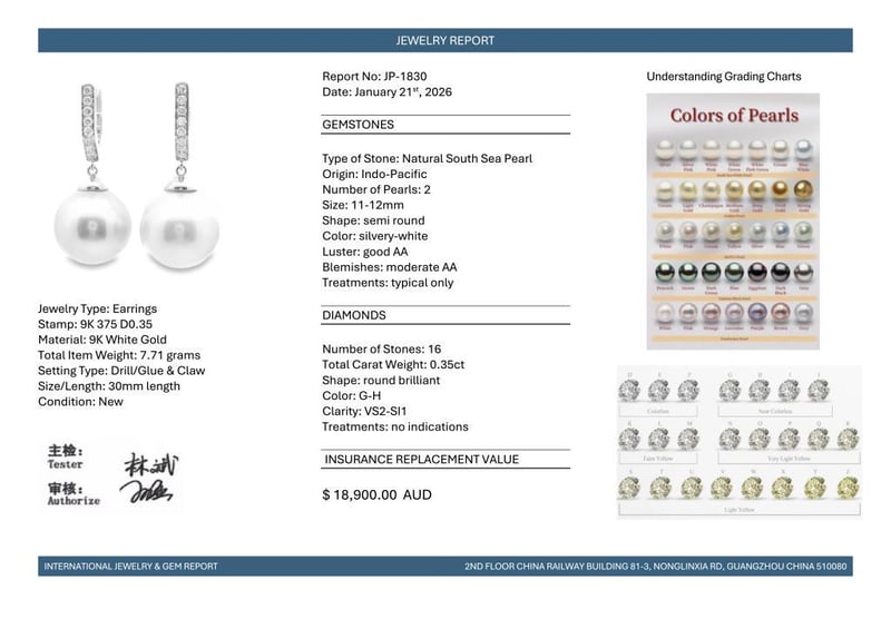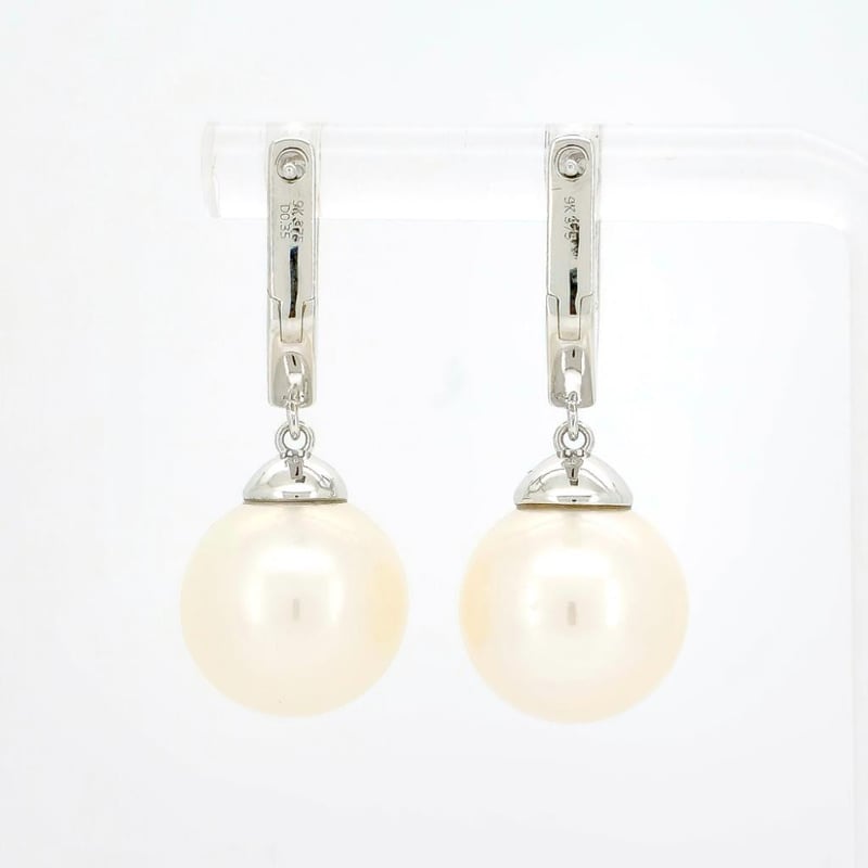 9CT WHITE GOLD SOUTH SEA PEARL AND DIAMOND DROP EARRINGS Featuring, 2 Silvery-White South Sea Pearls (11-12Mm Size, Aa Grade), With 16 Round Brilliant Cut Diamonds (0.35Ct Tdw, G-H Colour, Vs2-Si1 Clarity), Claw Set. Valuations Provided by an Independent Third-Party Professional Not Directly Associated With Lloyds Auctions at AUD $18900This valuation has been conducted by an independent third-party professional. The valuation amount is an assessment by the issuing valuer and does not reflect the auction value of the item. Any inquiries regarding the valuation should be directed to the issuing valuer (refer to contact details on the certificate), as Lloyds Auctions has no affiliation or influence over the valuation, the valuer, or the stated amount. Condition: Good - Refer Images 0582907+2043