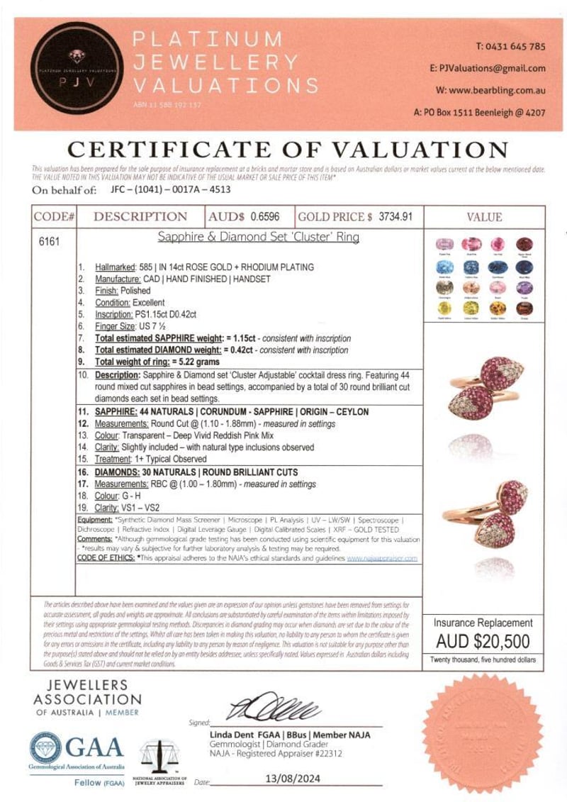 14CT ROSE GOLD PINK CEYLON SAPPHIRE AND DIAMOND DRESS RING Featuring, 44 Round Cut, Deep Vivid Reddish-Pink Ceylon Sapphires (1.15Ct Tsw, Slightly Included), Bead Set, With 30 Round Brilliant Cut Diamonds (0.42Ct Tdw, G-H Colour, Vs1-Vs2 Clarity), Bead Set. Ring Size O. Valuations Provided by an Independent Third-Party Professional Not Directly Associated With Lloyds Auctions at AUD $20500This valuation has been conducted by an independent third-party professional. The valuation amount is an assessment by the issuing valuer and does not reflect the auction value of the item. Any inquiries regarding the valuation should be directed to the issuing valuer (refer to contact details on the certificate), as Lloyds Auctions has no affiliation or influence over the valuation, the valuer, or the stated amount. Condition: Good - Refer Images 0582907+2045