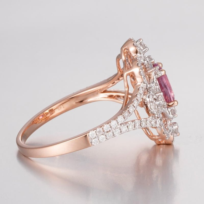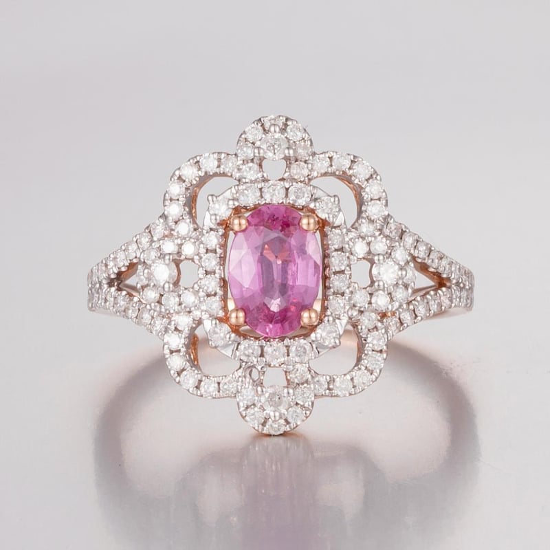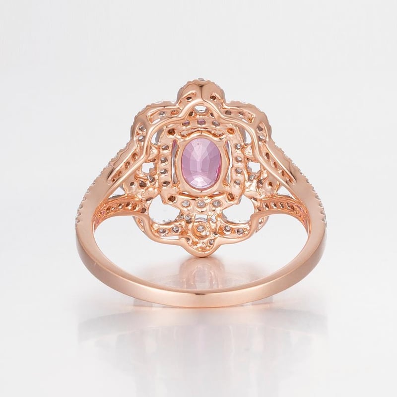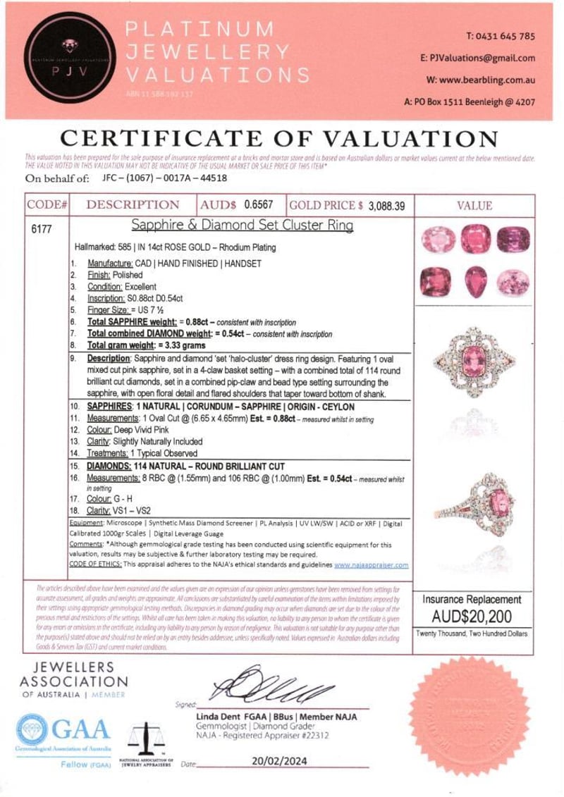 14CT ROSE GOLD PINK CEYLON SAPPHIRE AND DIAMOND HALO CLUSTER RING Featuring Centre, One Oval Cut, Deep Vivid Pink Ceylon Sapphire (0.88Ct, Slightly Included), Claw Set, With 114 Round Brilliant Cut Diamonds (0.54Ct Tdw, G-H Colour, Vs1-Vs2 Clarity), Bead Set. Ring Size O. Valuations Provided by an Independent Third-Party Professional Not Directly Associated With Lloyds Auctions at AUD $20200This valuation has been conducted by an independent third-party professional. The valuation amount is an assessment by the issuing valuer and does not reflect the auction value of the item. Any inquiries regarding the valuation should be directed to the issuing valuer (refer to contact details on the certificate), as Lloyds Auctions has no affiliation or influence over the valuation, the valuer, or the stated amount. Condition: Good - Refer Images 0582907+2058