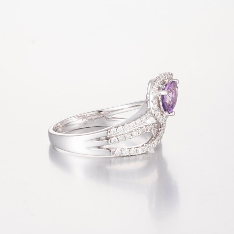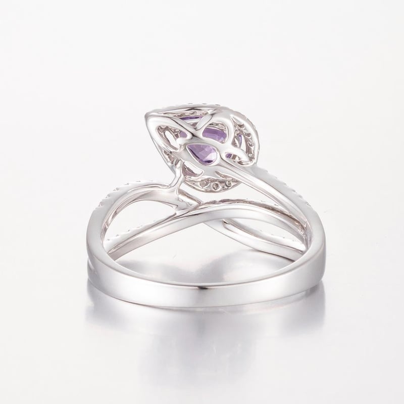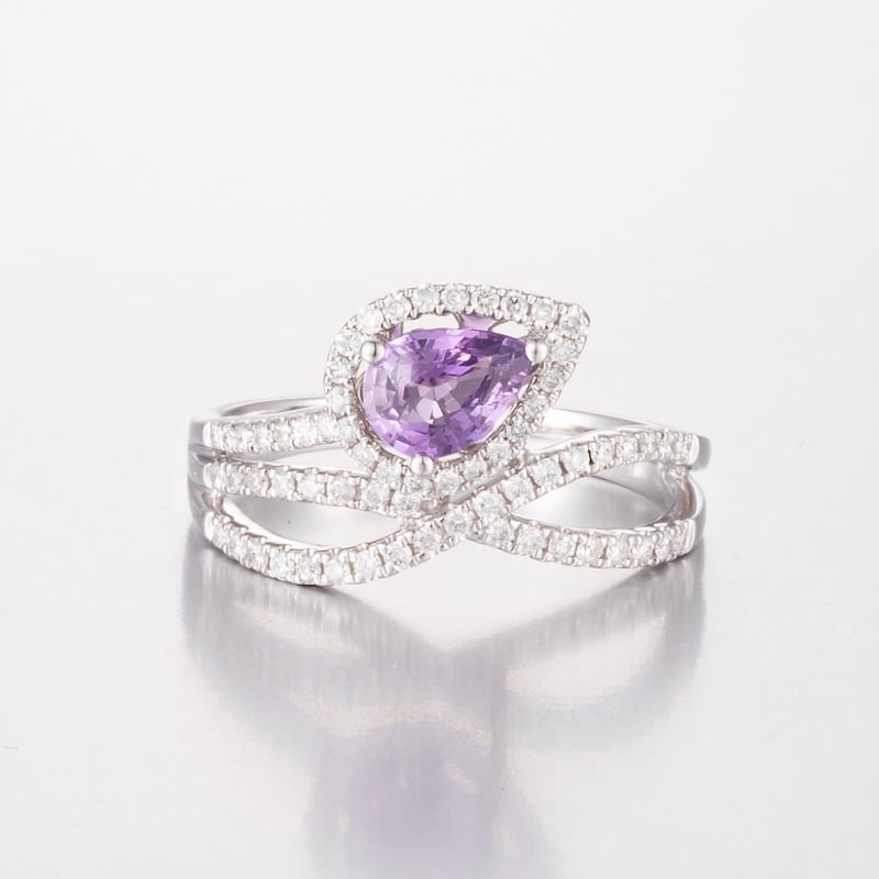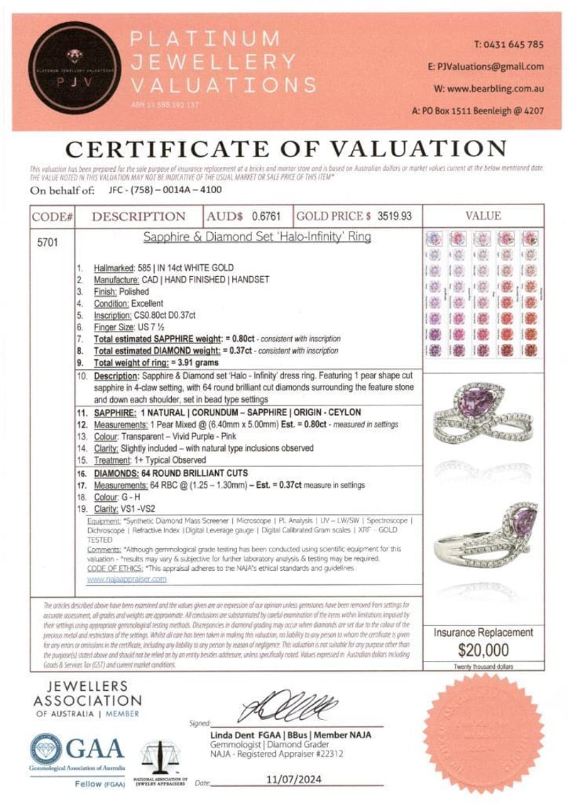 14CT WHITE GOLD PURPLE CEYLON SAPPHIRE AND DIAMOND TWIST RING Featuring Centre, One Pear Cut, Vivid Purple Ceylon Sapphire (0.80Ct Slightly Included), Claw Set With 64 Round Brilliant Cut Diamonds (0.37Ct Tdw, G-H Colour, Vs1-Vs2 Clarity), Bead Set. Ring Size O. Valuations Provided by an Independent Third-Party Professional Not Directly Associated With Lloyds Auctions at AUD $20000This valuation has been conducted by an independent third-party professional. The valuation amount is an assessment by the issuing valuer and does not reflect the auction value of the item. Any inquiries regarding the valuation should be directed to the issuing valuer (refer to contact details on the certificate), as Lloyds Auctions has no affiliation or influence over the valuation, the valuer, or the stated amount. Condition: Good - Refer Images 0582907+2047