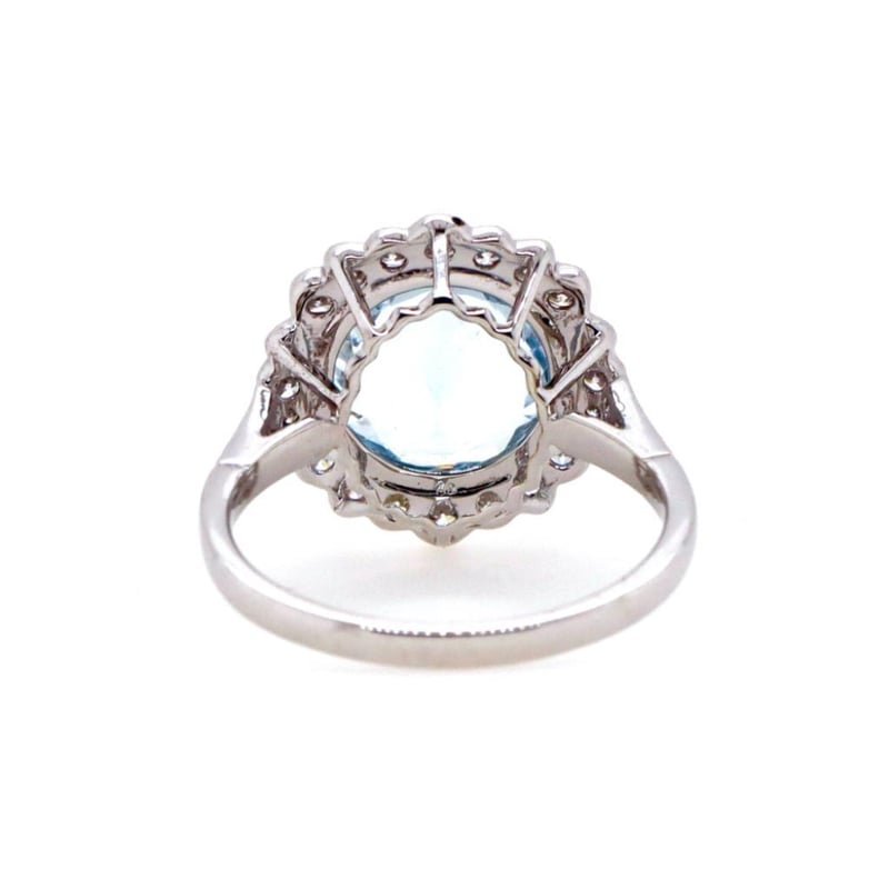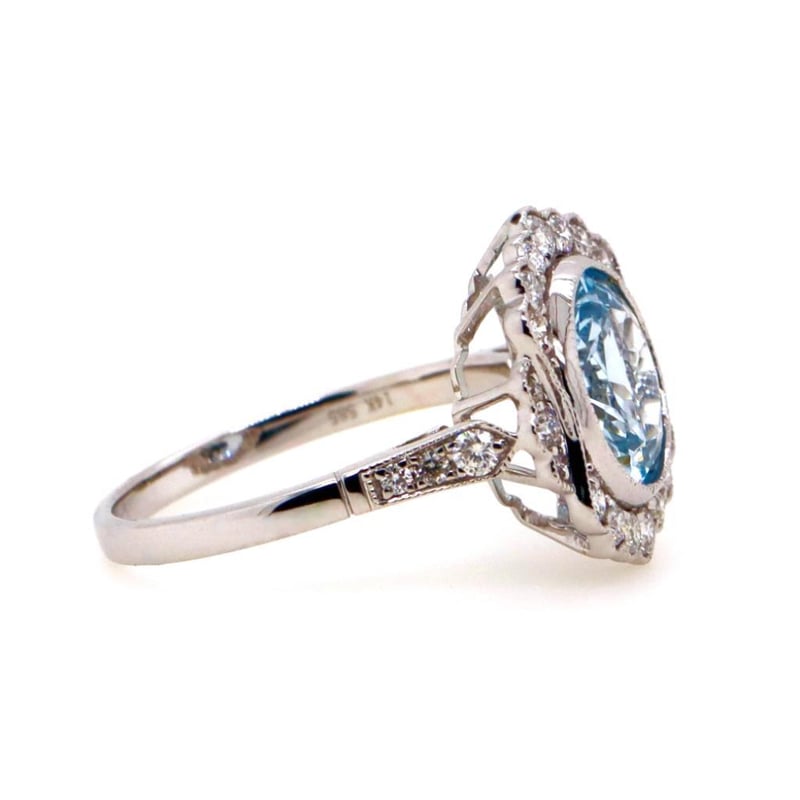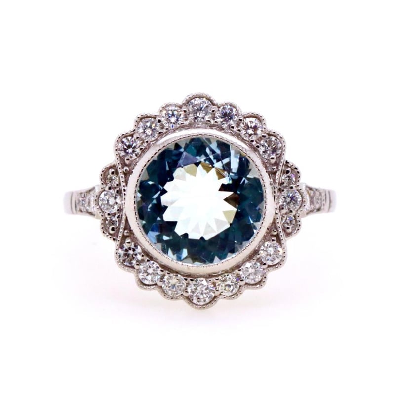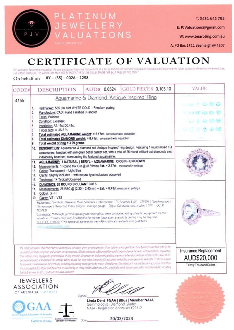 14CT WHITE GOLD AQUAMARINE AND DIAMOND ANTIQUE STYLE RING Featuring Centre, One Round Cut, Light Blue Aquamarine (2.17Ct, Slightly Included), Bezel Set, With 26 Round Brilliant Cut Diamonds (0.41Ct Tdw, G-H Colour, Vs1-Vs2 Clarity), Bead Set. Ring Size M. Valuations Provided by an Independent Third-Party Professional Not Directly Associated With Lloyds Auctions at AUD $20000This valuation has been conducted by an independent third-party professional. The valuation amount is an assessment by the issuing valuer and does not reflect the auction value of the item. Any inquiries regarding the valuation should be directed to the issuing valuer (refer to contact details on the certificate), as Lloyds Auctions has no affiliation or influence over the valuation, the valuer, or the stated amount. Condition: Good - Refer Images 0582907+2037