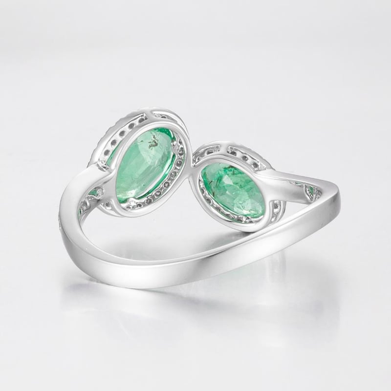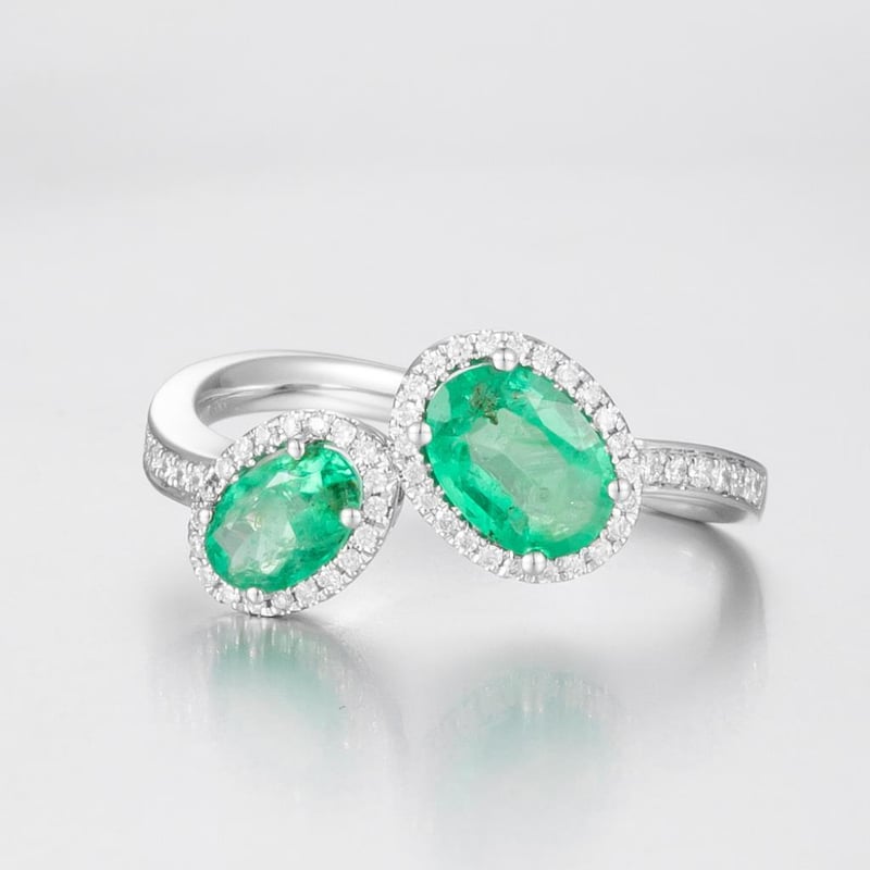 Featuring Centre, 2 Oval Cut Cut Light Vivid Green Colombian Emeralds (1.09Ct Tsw, Heavy Inclusions), Claw Set, With 59 Round Brilliant Cut Diamonds (0.18Ct Tdw, G-H Colour, Si1-Si2 Clarity), Bead Set. Ring Size O.