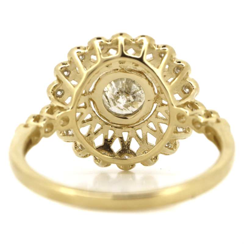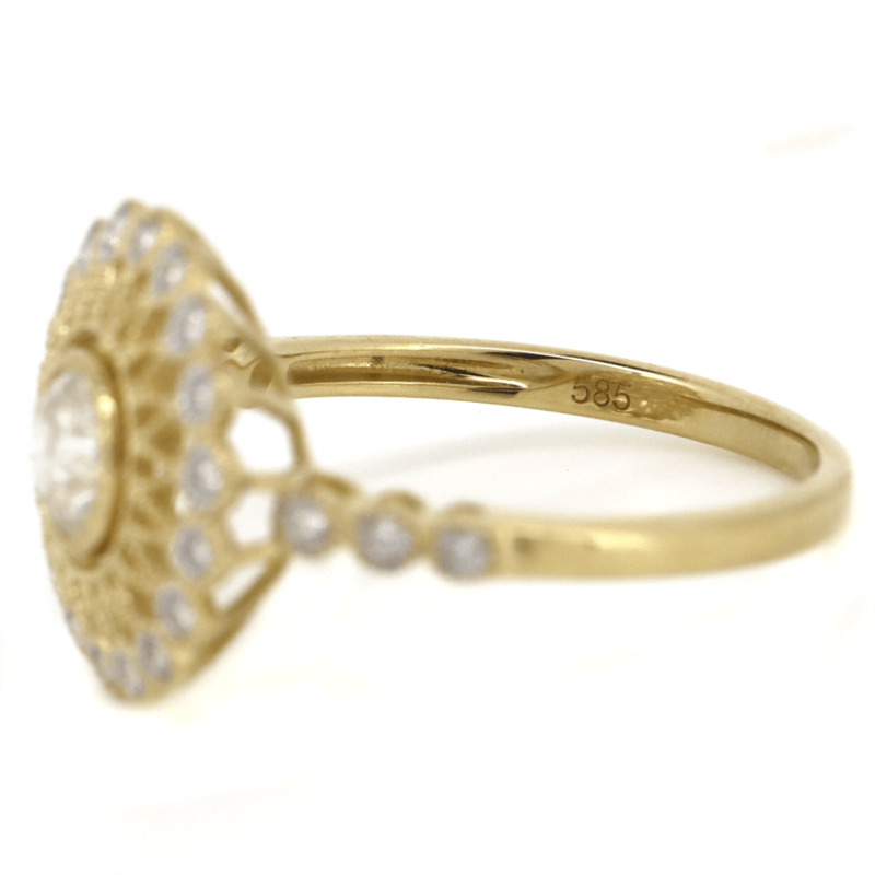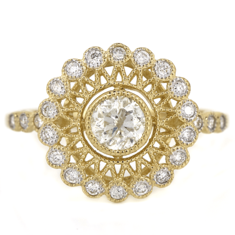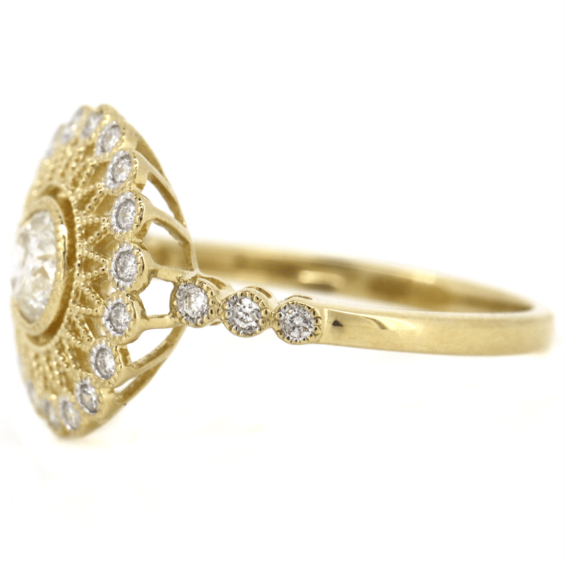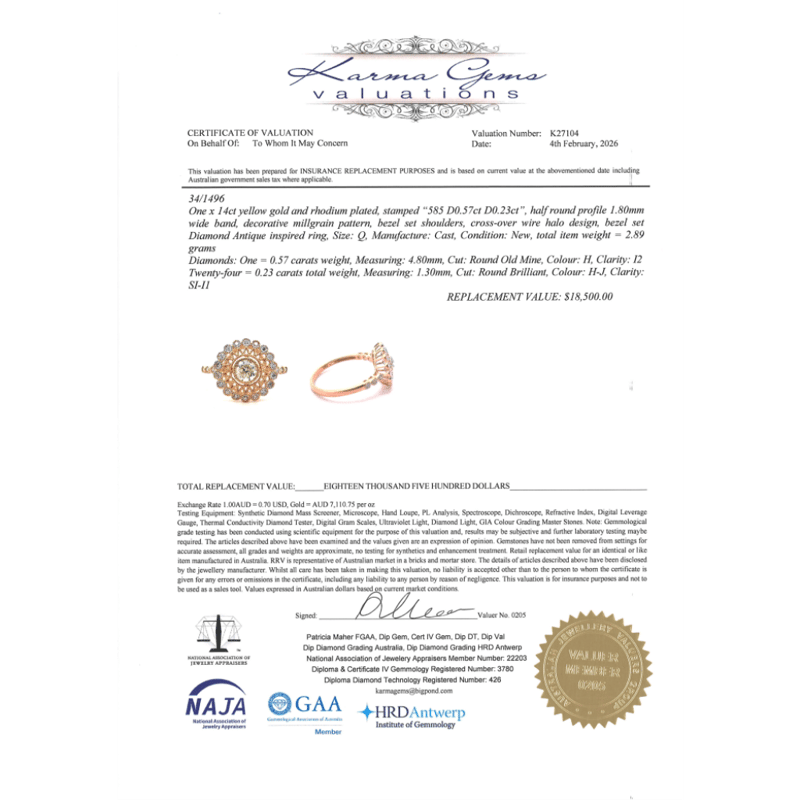 14K YELLOW GOLD AND DIAMOND, ANTIQUE-INSPIRED RING. The Centre Features, One Old Mine Cut, Diamond (0.57Ct Tdw, H Colour, I2 Clarity), Bezel Set With Millegrain Detail. Surrounding The Centre In A Halo And Decorating The Band Are, 24 Round Brilliant Cut, Diamonds (0.23Ct Tdw, H-J Colour, Si-I1 Clarity), Bezel Set With Millegrain Detail. Ring Size Q. Valuations Provided by an Independent Third-Party Professional Not Directly Associated With Lloyds Auctions at AUD $$18,500.00This valuation has been conducted by an independent third-party professional. The valuation amount is an assessment by the issuing valuer and does not reflect the auction value of the item. Any inquiries regarding the valuation should be directed to the issuing valuer (refer to contact details on the certificate), as Lloyds Auctions has no affiliation or influence over the valuation, the valuer, or the stated amount. Condition: Good - Refer Images 0645959+204
