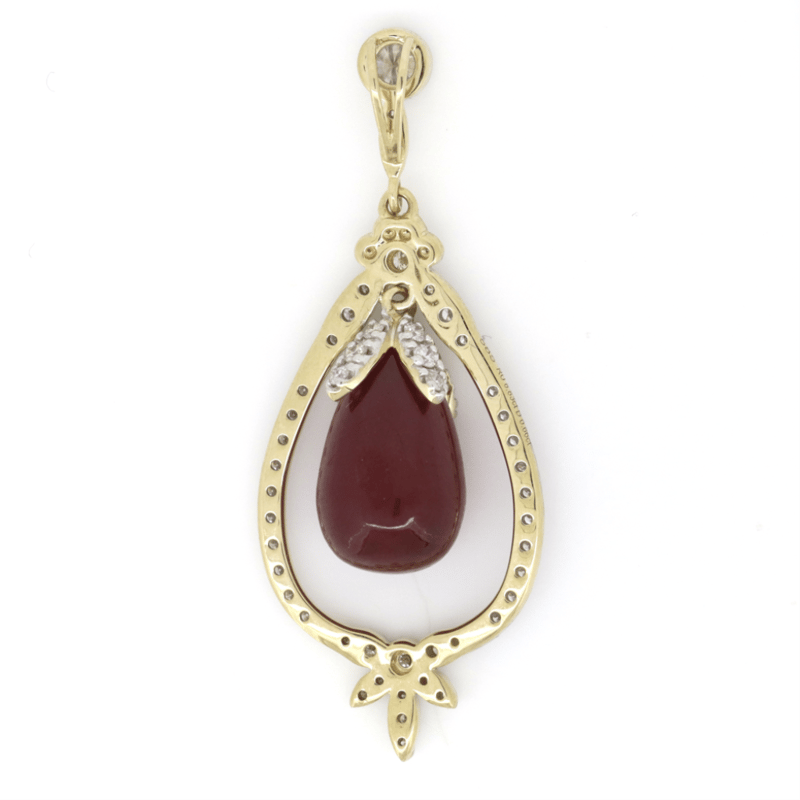 14K YELLOW GOLD, 8.38CT RUBY AND DIAMOND, TEARDROP PENDANT.