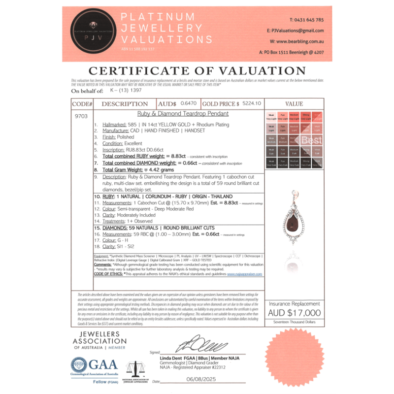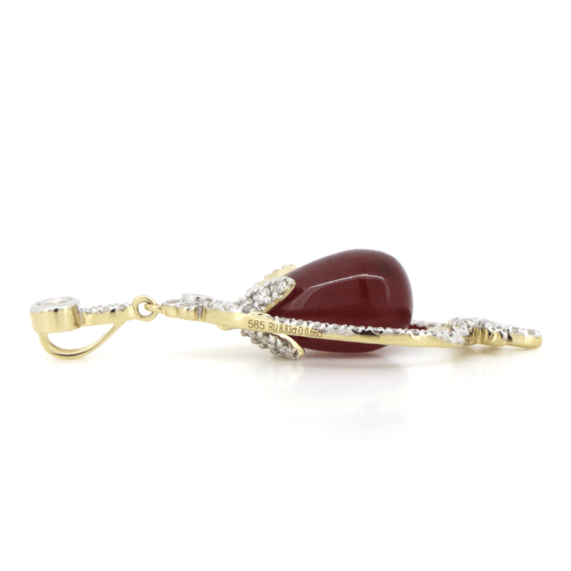 The Pendant Features, One Drop/Cabochon Cut, Deep Moderate Red, Ruby (8.38Ct, Moderate Inclusions), Multi Claw Set. Embellishing The Design Are, 59 Round Brilliant Cut, Diamonds (0.66Ct Tdw, G-H Colour, Si1-Si2 Clarity), Bezel/Pip Set.