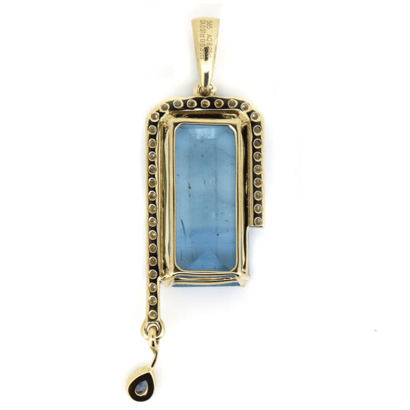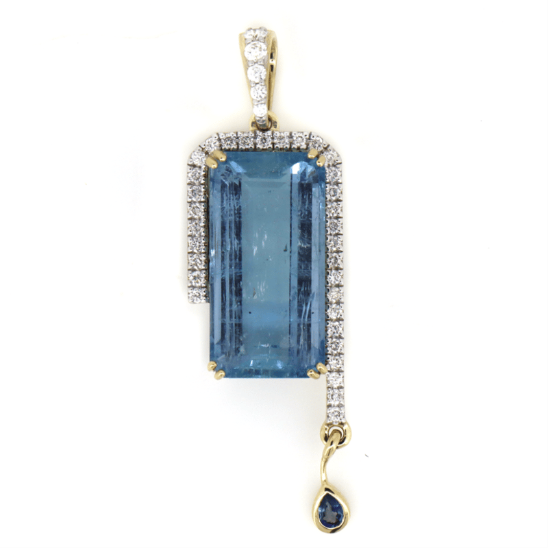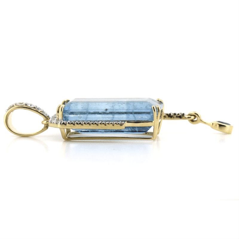 14K YELLOW GOLD, AQUAMARINE, SAPPHIRE AND DIAMOND, PENDANT. The Centre Features, One Emerald Cut, Aquamarine (8.25Ct, Heavy Eye Visible Inclusions), Claw Set. Encompassing The Centre And Decorating The Bail Are, 37 Round Brilliant Cut, Diamonds (0.31Ct Tdw, G-I Colour, Si-I2 Clarity), Claw Set. Decorating The Drop Are, One Pear Faceted Cut, Sapphire (0.07Ct, Light Inclusions), Bezel Set. Valuations Provided by an Independent Third-Party Professional Not Directly Associated With Lloyds Auctions at AUD $$18,800.00This valuation has been conducted by an independent third-party professional. The valuation amount is an assessment by the issuing valuer and does not reflect the auction value of the item. Any inquiries regarding the valuation should be directed to the issuing valuer (refer to contact details on the certificate), as Lloyds Auctions has no affiliation or influence over the valuation, the valuer, or the stated amount. Condition: Good - Refer Images 0645959+220