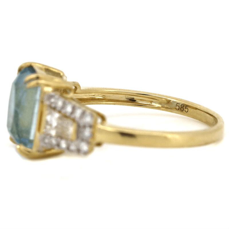 14K YELLOW GOLD, AQUAMARINE AND DIAMOND, DRESS RING.