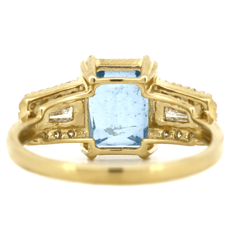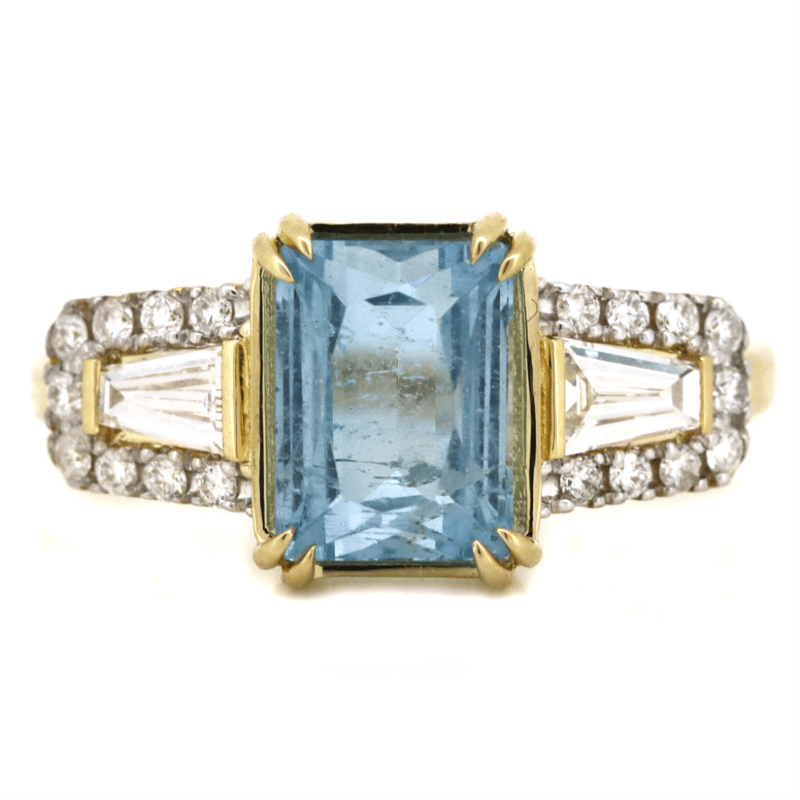 The Centre Features, One Radiant Cut, Aquamarine (1.97Ct, Minor Eye Visible Inclusions), Double Claw Set. Flanking The Centre Are, 2 Baguette Cut, Diamonds (0.25Ct Tdw, G-H Colour, Si1 Clarity) Bar Set. Encompassing The Diamonds Are, 18 Round Brilliant Cut, Diamonds (0.15Ct Tdw, H-J Colour, Si1-I1 Clarity), Bead Set. Ring Size M.