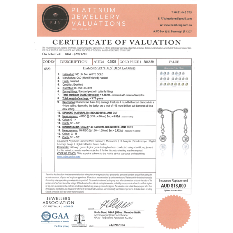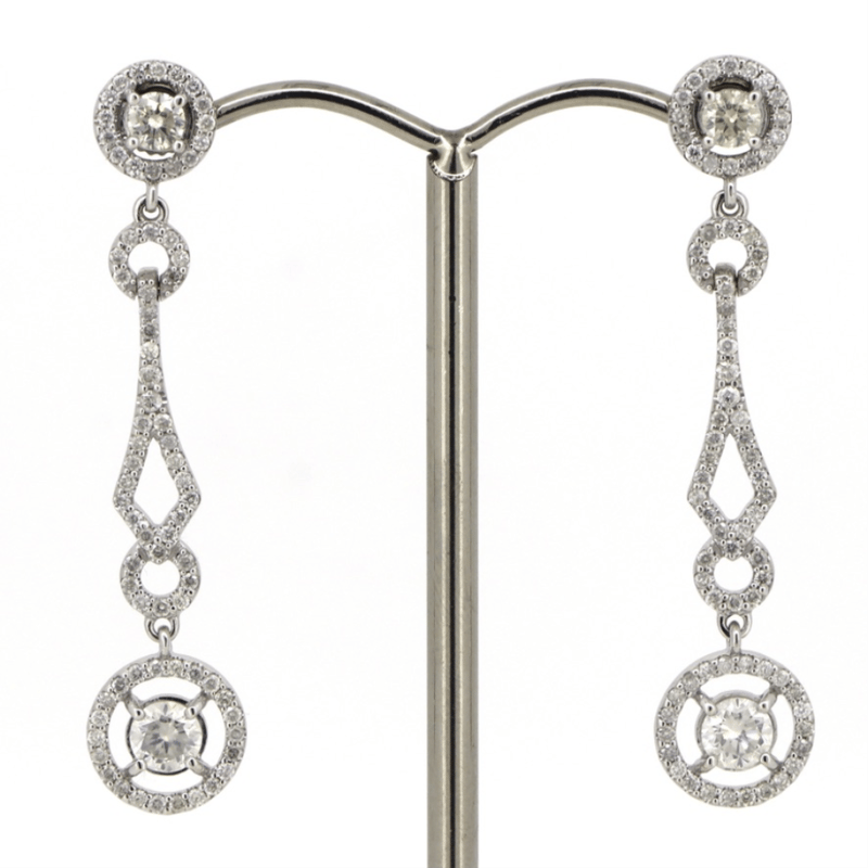 The Design Features, 4 Round Brilliant Cut, Diamonds (0.85Ct Tdw, G-H Colour, Si1-Si2 Clarity), Bezel Set. Encompassing The Design Are, 146 Round Brilliant Cut, Diamonds (0.732Ct Tdw, G-H Colour, Si1-Si2 Clarity), Micro-Bead Set. The Earrings Have Post Backs, With 14K White Gold Butterfly Clasps.
