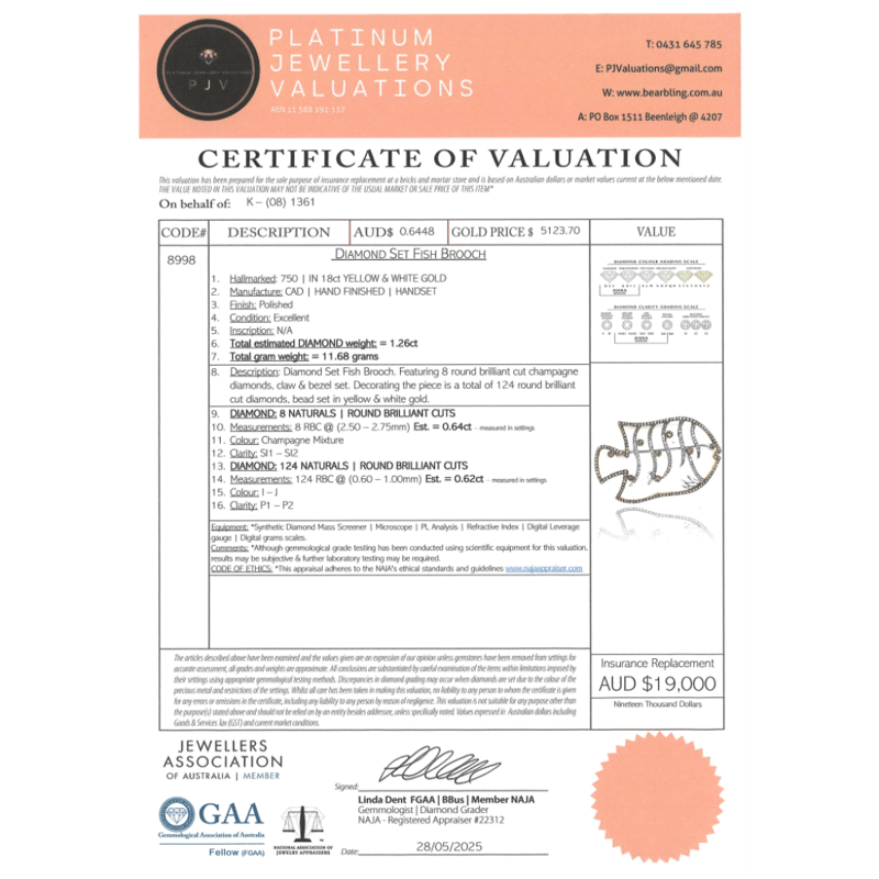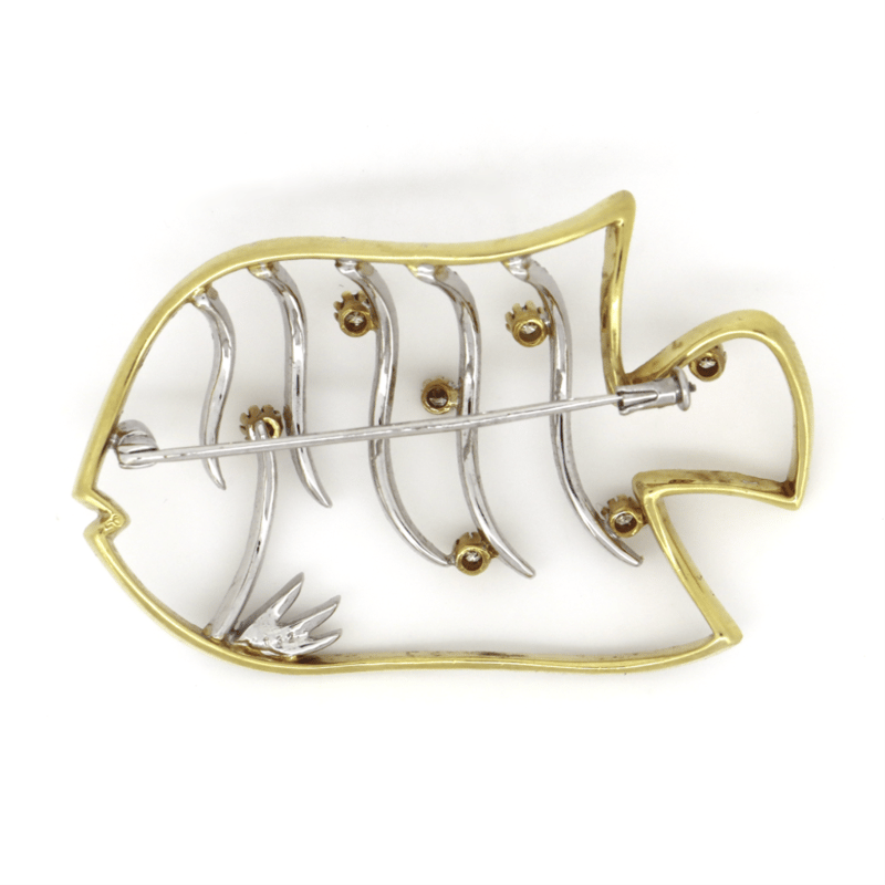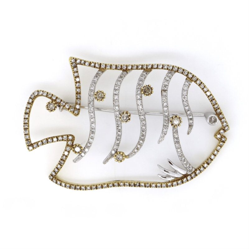 18K YELLOW/WHITE GOLD, CHAMPAGNE DIAMOND AND DIAMOND, FISH BROOCH.