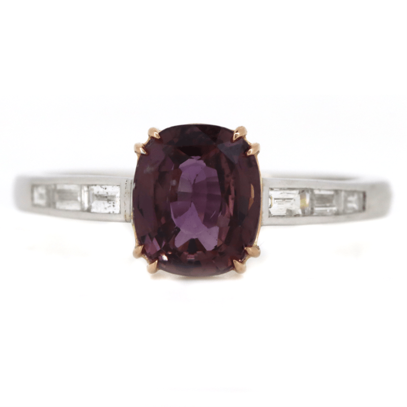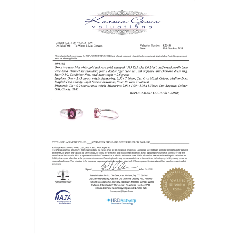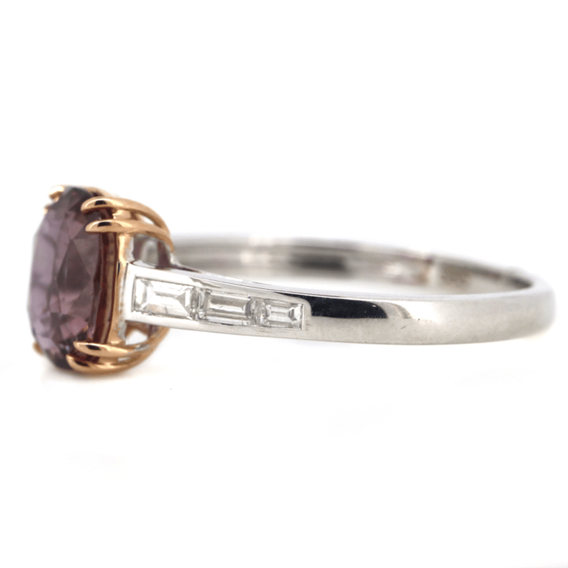 The Centre Features, One Oval Mixed Cut, Pink Sapphire (2.43Ct, Light Natural Inclusions), Claw Set. Decorating The Band Are, 6 Baguette Cut, Diamonds (0.24Ct Tdw, G-H Colour, Si-I2 Clarity), Channel Set. Ring Size O 1/2.