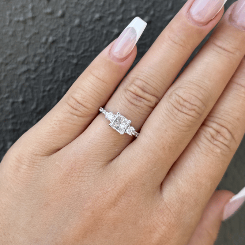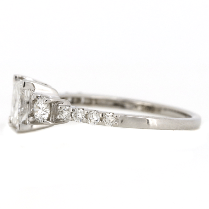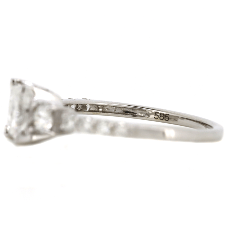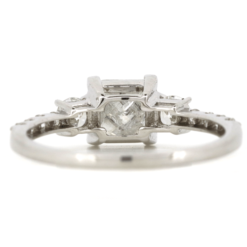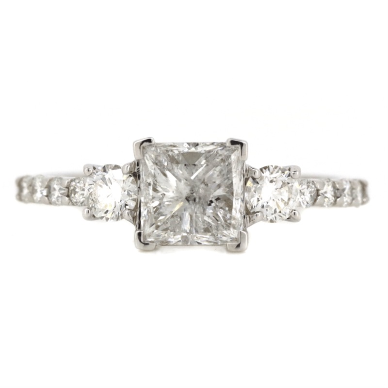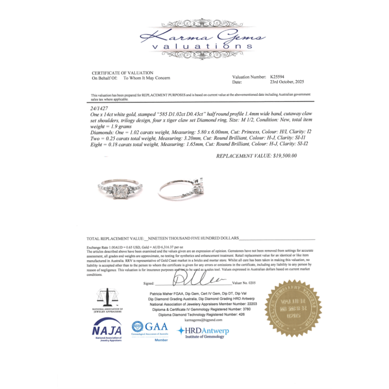 14K WHITE GOLD AND DIAMOND, TRILOGY RING. The Centre Features, One Princess Cut, Diamond (1.02Ct, H-I Colour, I2 Clarity), 4 Claw Set. Flanking The Centre And Decorating The Band Are, 2 Princess Cut And 8 Round Brilliant Cut, Diamonds (0.43Ct Tdw, H-J Colour, Si-I2 Clarity), 4 Claw Set. Ring Size M 1/2. Valuations Provided by an Independent Third-Party Professional Not Directly Associated With Lloyds Auctions at AUD $$19,500.00This valuation has been conducted by an independent third-party professional. The valuation amount is an assessment by the issuing valuer and does not reflect the auction value of the item. Any inquiries regarding the valuation should be directed to the issuing valuer (refer to contact details on the certificate), as Lloyds Auctions has no affiliation or influence over the valuation, the valuer, or the stated amount. Condition: Good - Refer Images 0645959+237