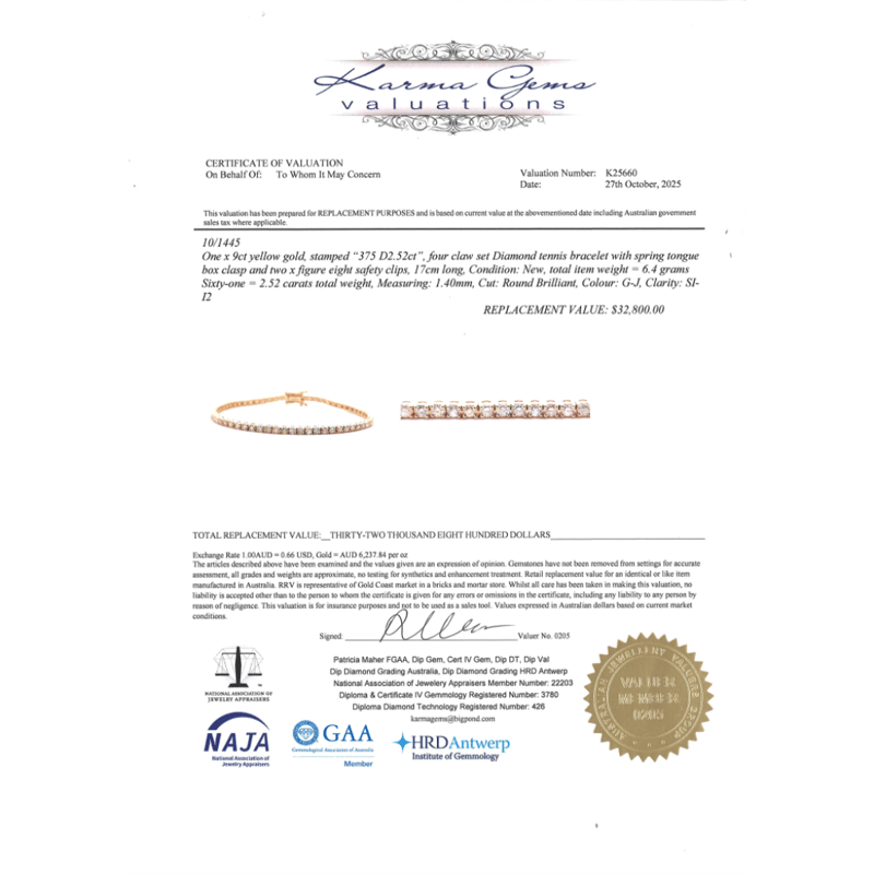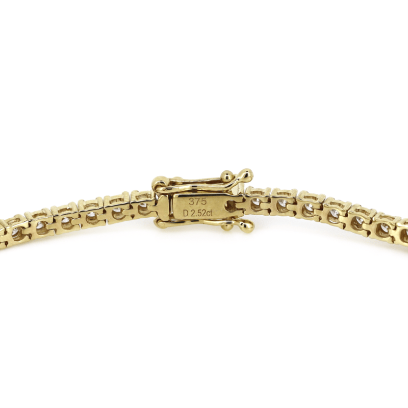 9K YELLOW GOLD AND 2.52CT TDW DIAMOND, TENNIS BRACELET. The Design Features, 61 Round Brilliant Cut, Diamonds (2.52Ct Tdw, G-J Colour, Si-I2 Clarity), 4 Claw Set. The Bracelet Has A Box Clasp With 2 Figure Eight Safety Clips. Bracelet Length Is 17Cm. Valuations Provided by an Independent Third-Party Professional Not Directly Associated With Lloyds Auctions at AUD $$32,800.00This valuation has been conducted by an independent third-party professional. The valuation amount is an assessment by the issuing valuer and does not reflect the auction value of the item. Any inquiries regarding the valuation should be directed to the issuing valuer (refer to contact details on the certificate), as Lloyds Auctions has no affiliation or influence over the valuation, the valuer, or the stated amount. Condition: Good - Refer Images 0645959+239