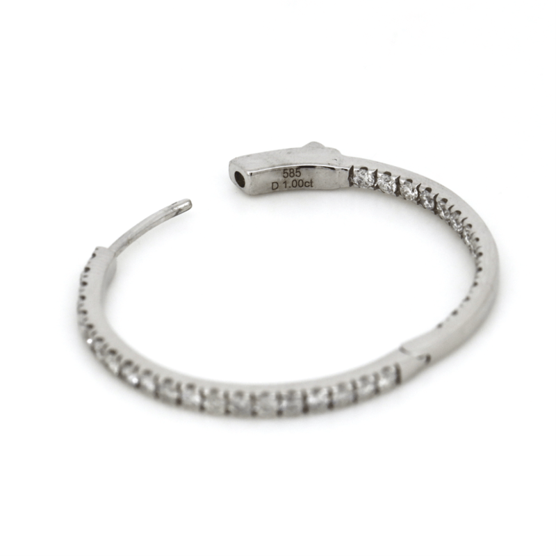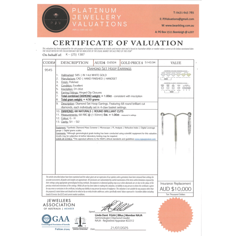 14K WHITE GOLD, 1.00CT TDW DIAMOND, HOOP EARRINGS. The Design Features, 68 Round Brilliant Cut, Diamonds (1.00Ct Tdw, G-H Colour, Si1-Si2 Clarity), Bead Set. The Earrings Have Hinged Snap Closures. Valuations Provided by an Independent Third-Party Professional Not Directly Associated With Lloyds Auctions at AUD $$10,000.00This valuation has been conducted by an independent third-party professional. The valuation amount is an assessment by the issuing valuer and does not reflect the auction value of the item. Any inquiries regarding the valuation should be directed to the issuing valuer (refer to contact details on the certificate), as Lloyds Auctions has no affiliation or influence over the valuation, the valuer, or the stated amount. Condition: Good - Refer Images 0645959+240