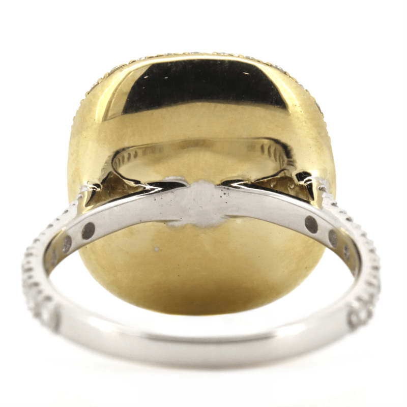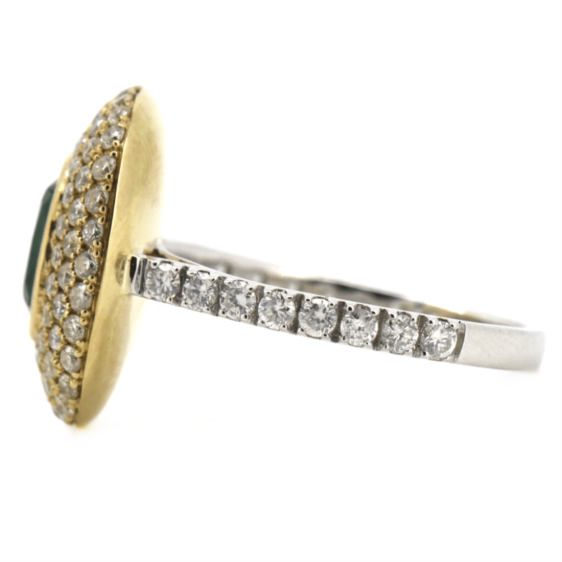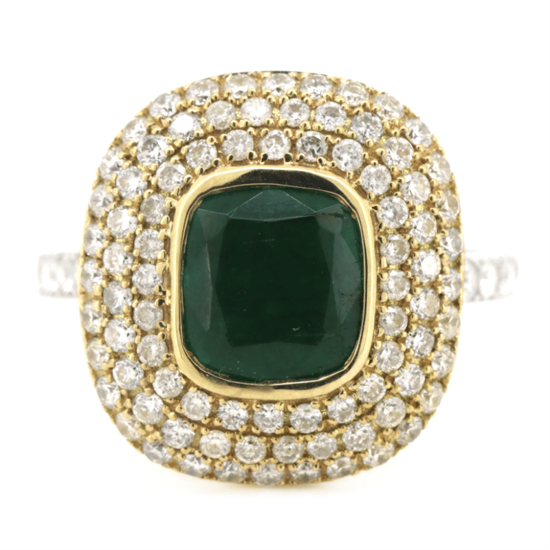 The Centre Design Features, One Cushion Cut, Dark Blue/Green, Emerald (1.65Ct, Slightly Included), Bezel Set In Yellow Gold. Encompassing The Design Are, 100 Round Brilliant Cut, Diamonds (1.08Ct Tdw, G-H Colour, Si1-Si2 Clarity), Micro-Claw Set In White/Yellow Gold. Ring Size M 1/2.
