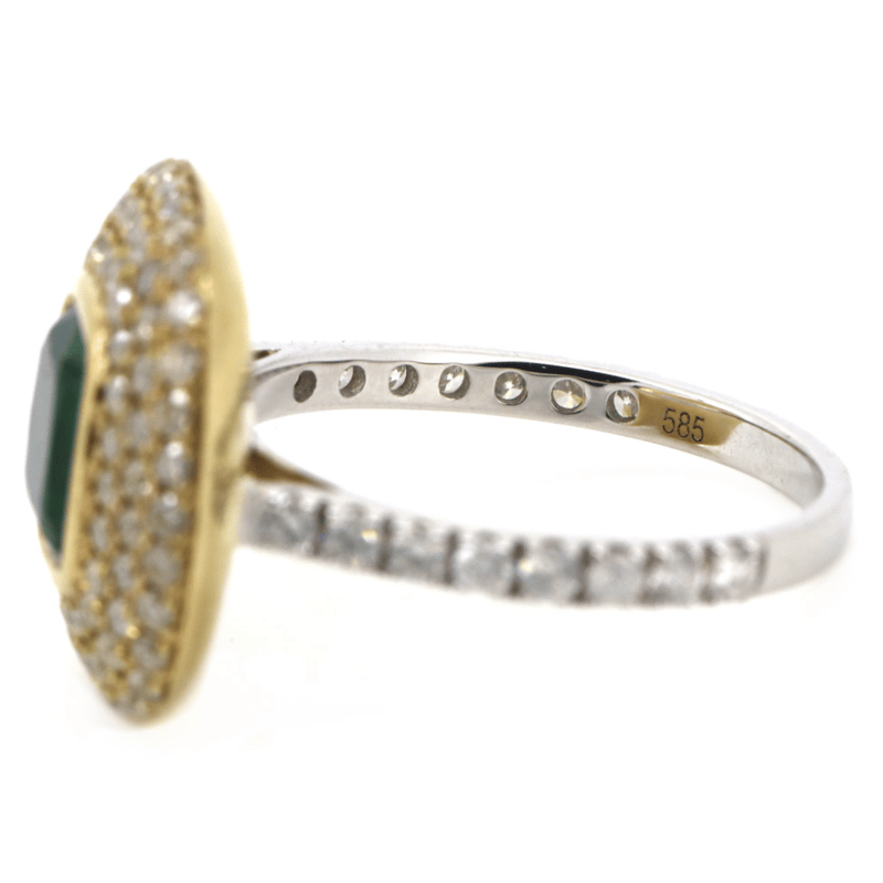 14K WHITE/YELLOW GOLD, EMERALD AND DIAMOND, HALO COCKTAIL RING.