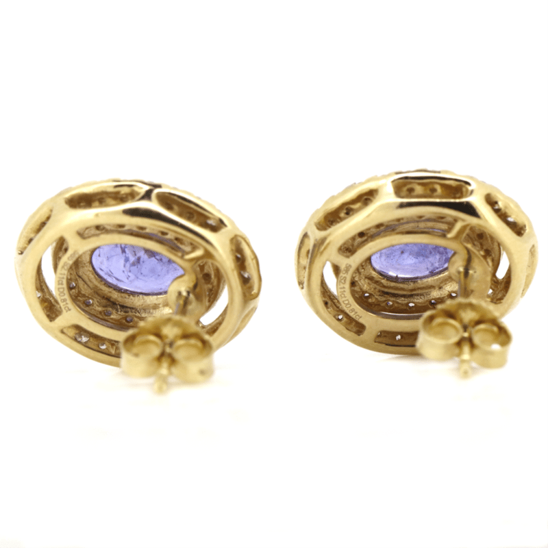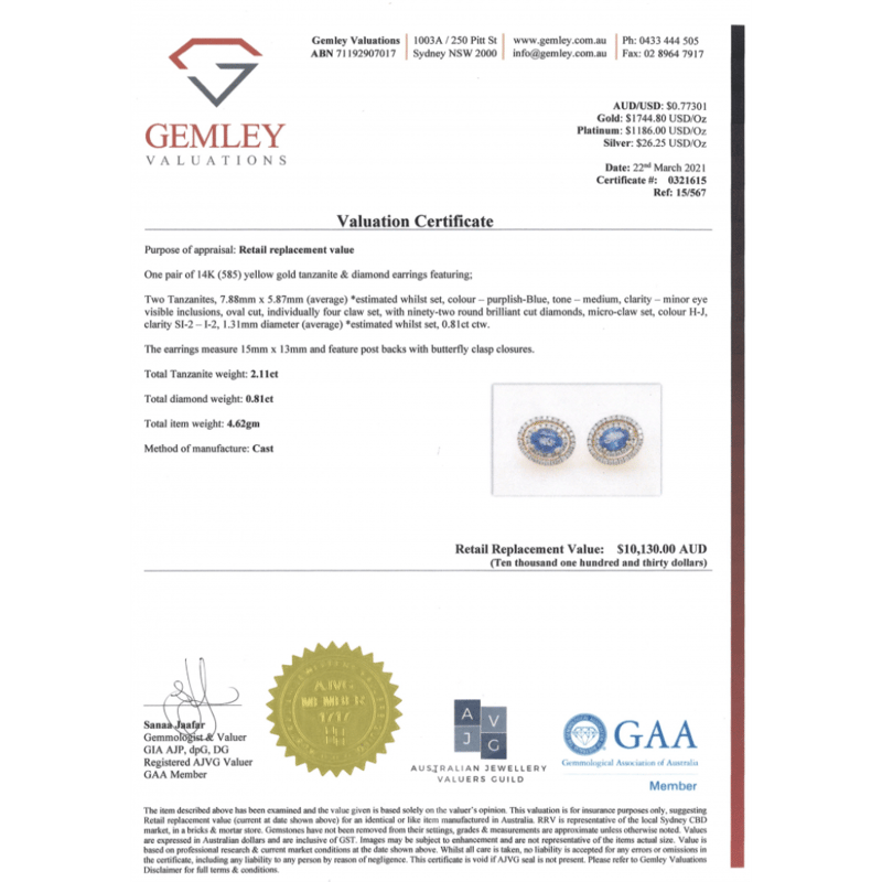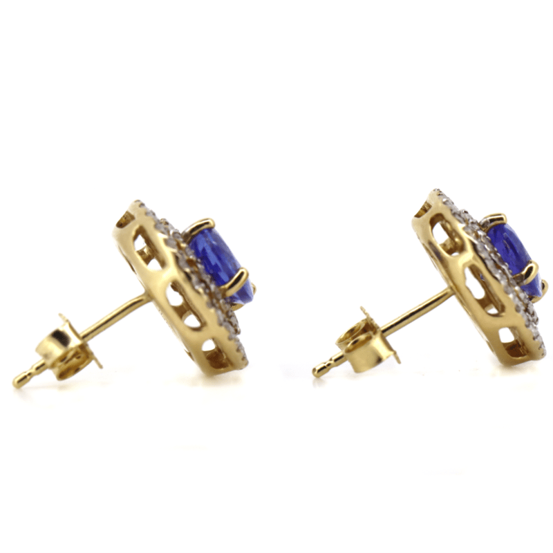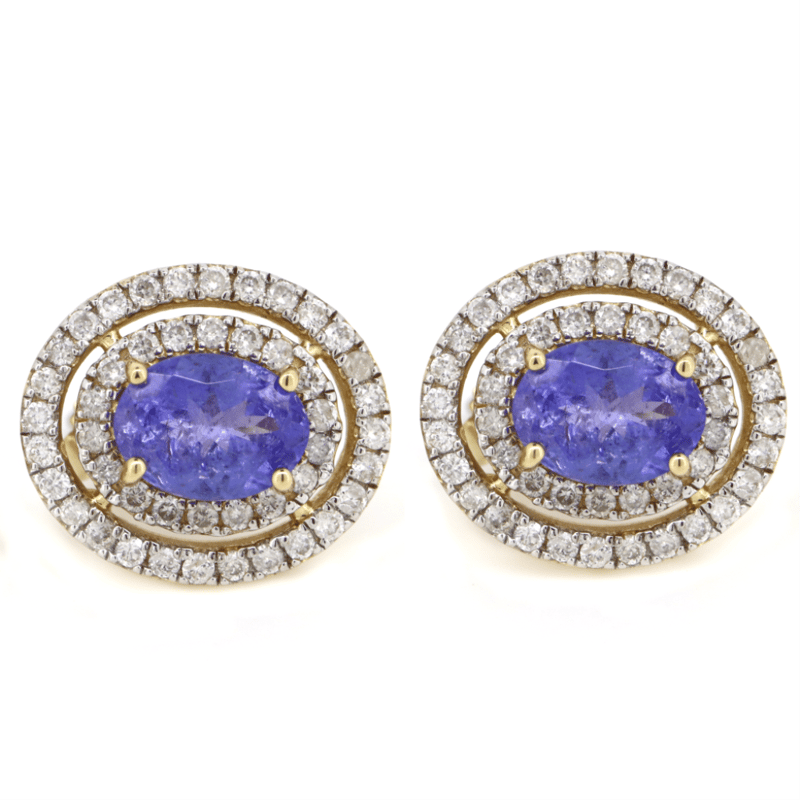14K YELLOW GOLD, TANZANITE AND DIAMOND, DOUBLE HALO STUD EARRINGS. The Centres Feature, 2 Oval Cut, Medium Purplish-Blue, Tanzanites (2.11Ct Tsw, Minor Eye Visible Inclusions), 4 Claw Set. Surrounding The Centres In Double Halos Are, 92 Round Brilliant Cut, Diamonds (0.81Ct Tdw, H-J Colour, Si2-I2 Clarity), Micro-Claw Set. The Earrings Have Post Backs, With 14K Yellow Gold Butterfly Clasps. Valuations Provided by an Independent Third-Party Professional Not Directly Associated With Lloyds Auctions at AUD $$10,130.00This valuation has been conducted by an independent third-party professional. The valuation amount is an assessment by the issuing valuer and does not reflect the auction value of the item. Any inquiries regarding the valuation should be directed to the issuing valuer (refer to contact details on the certificate), as Lloyds Auctions has no affiliation or influence over the valuation, the valuer, or the stated amount. Condition: Good - Refer Images 0645959+247