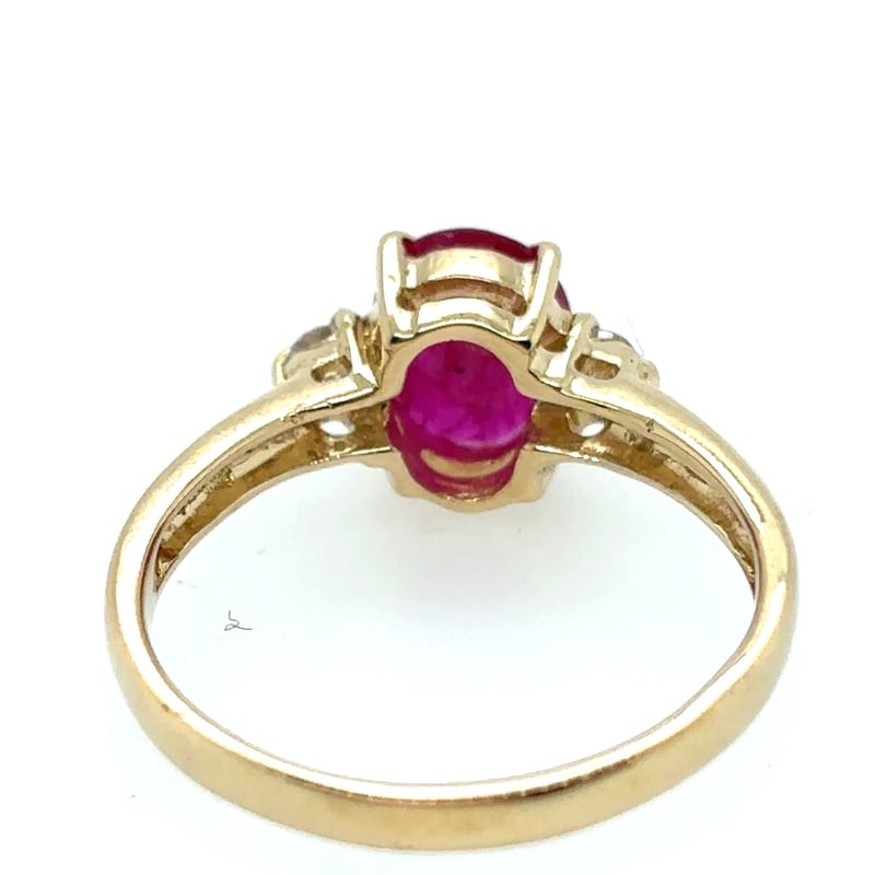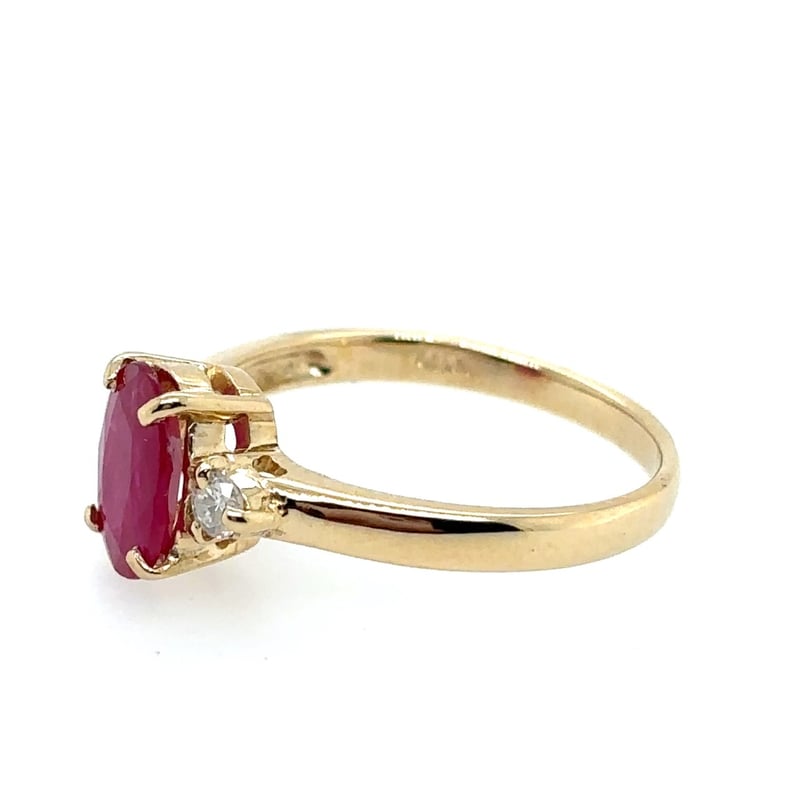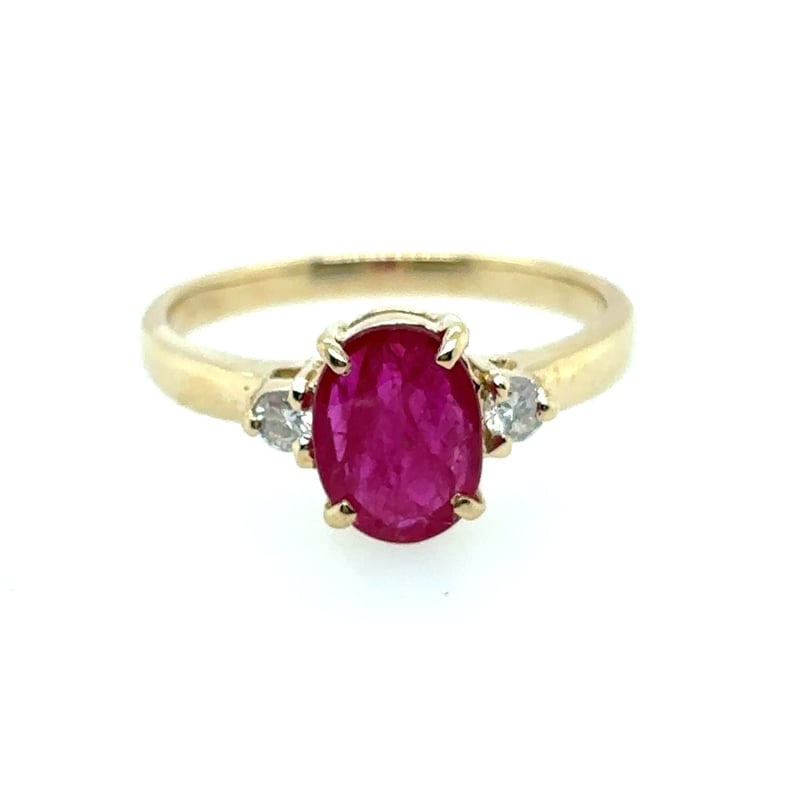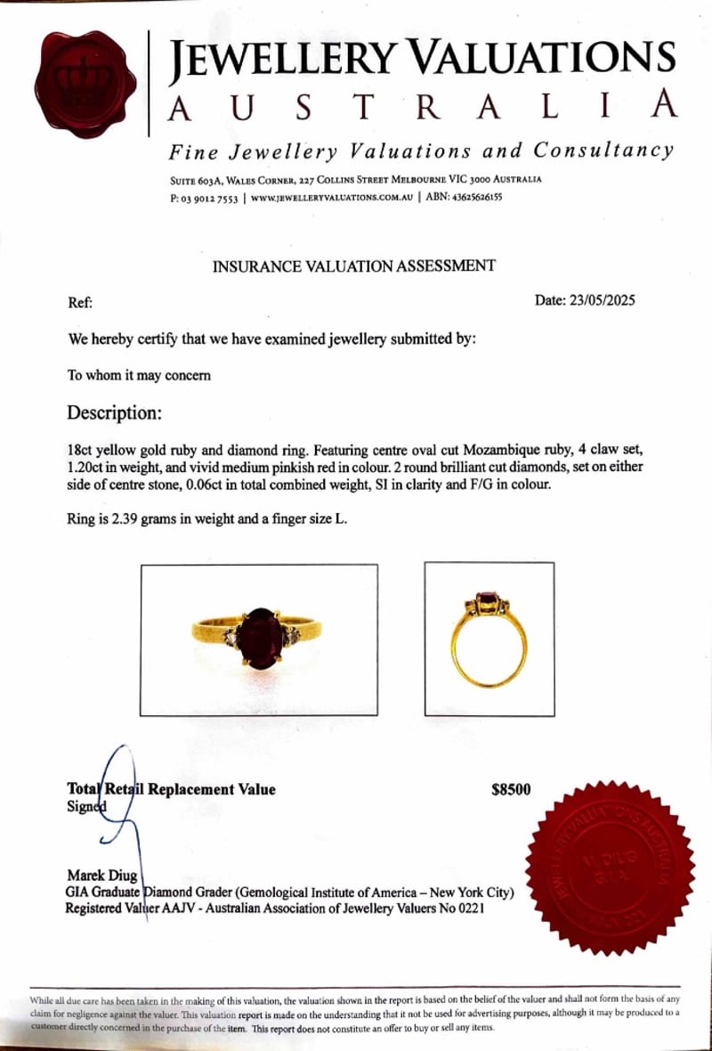 18CT YELLOW GOLD RUBY AND DIAMOND RINGFeaturing Centre Oval Cut Mozambique Ruby, 4 Claw Set, 1.20Ct In Weight, And Vivid Medium Pinkish Red In Colour. 2 Round Brilliant Cut Diamonds, Set On Either Side Of Centre Stone, 0.06Ct In Total Combined Weight, Si In Clarity And F/G In Colour.Ring Is 2.39 Grams In Weight And A Finger Size L.Condition: Good - Refer To ImagesThis valuation has been conducted by an independent third-party professional. The valuation amount is an assessment by the issuing valuer and does not reflect the auction value of the item.Any inquiries regarding the valuation should be directed to the issuing valuer (refer to contact details on the certificate), as Lloyds Auctions has no affiliation or influence over the valuation, the valuer, or the stated amount.Insurance Replacement Valuation Amount: $8,500.00163084+11