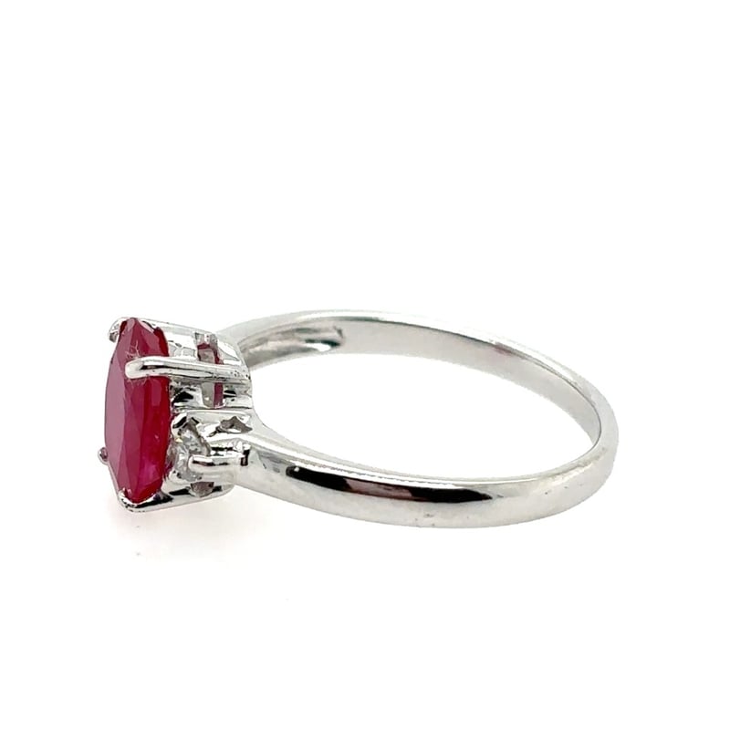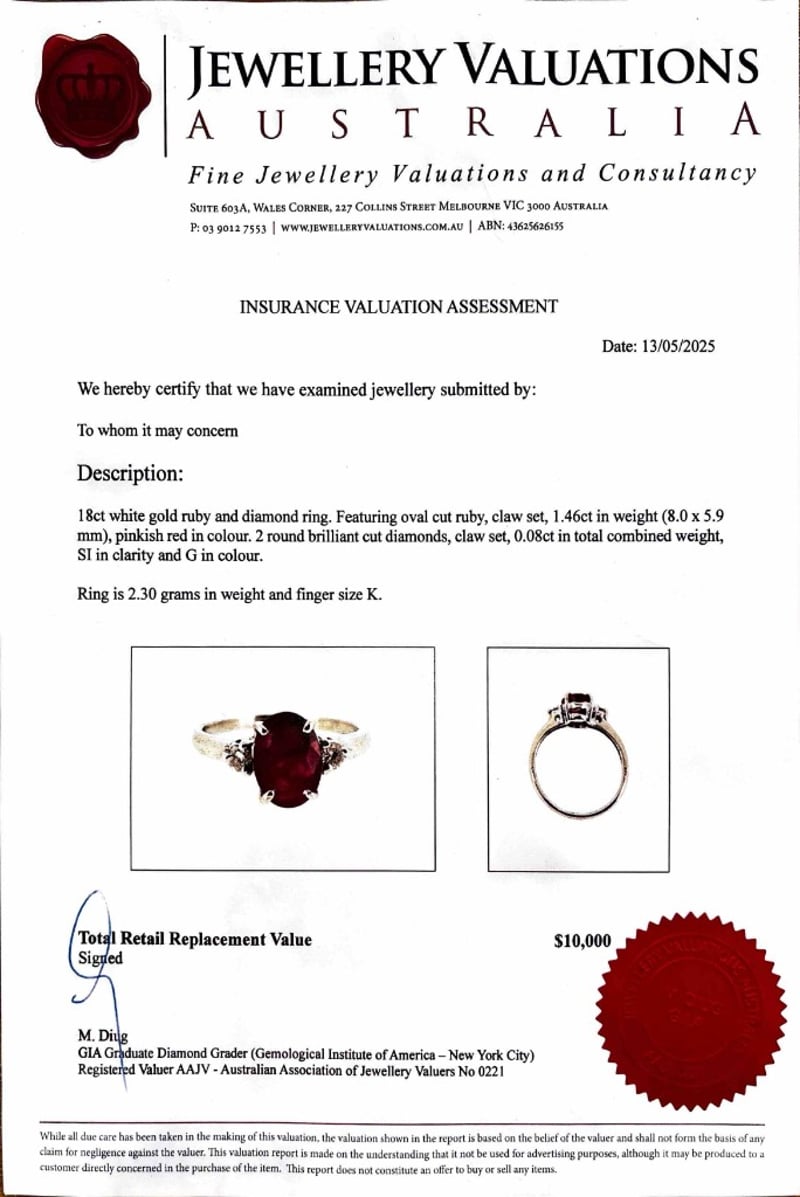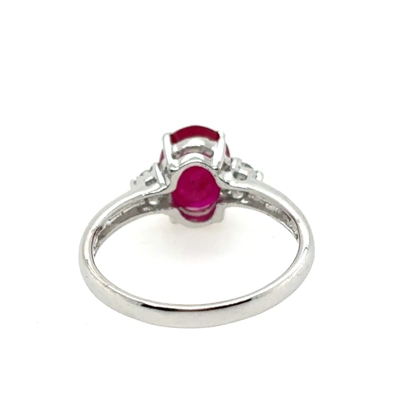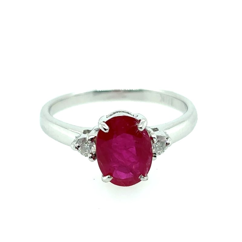 Featuring Oval Cut Ruby, Claw Set, 1.46Ct In Weight (8.0 X 5.9 Mm), Pinkish Red In Colour. 2 Round Brilliant Cut Diamonds, Claw Set, 0.08Ct In Total Combined Weight, Si In Clarity And G In Colour.