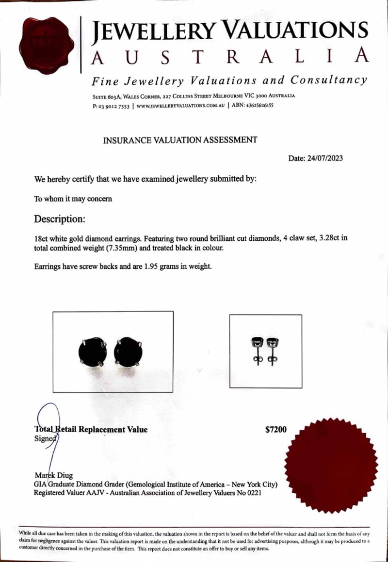 Featuring Two Round Brilliant Cut Diamonds, 4 Claw Set, 3.28Ct In Total Combined Weight (7.35Mm) And Treated Black In Colour.