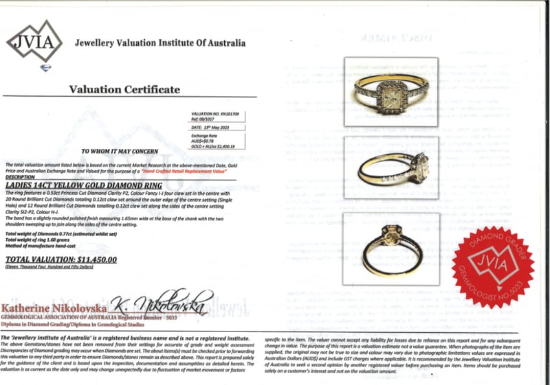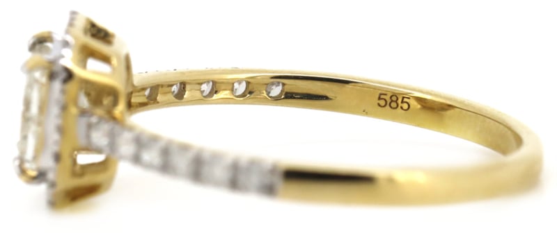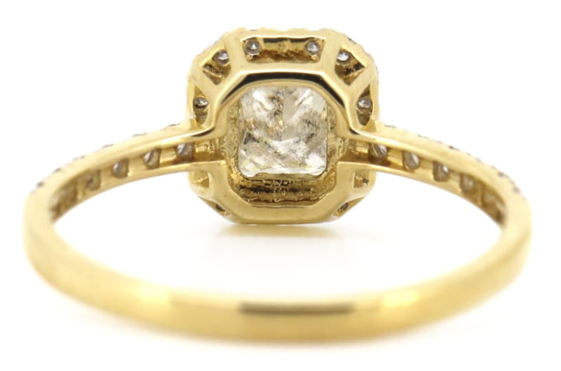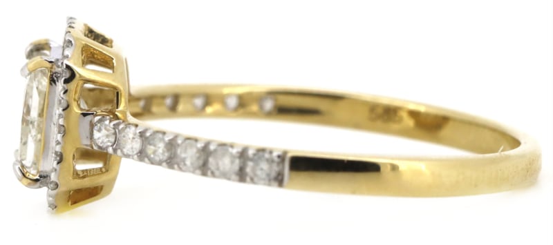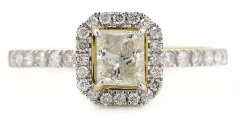 14K YELLOW GOLD AND DIAMOND, HALO RINGThe Centre Features, One Princess Cut, Diamond (0.53Ct, I-J Colour, P2 Clarity), Claw Set. Surrounding The Centre And Decorating The Band Are, 32 Round Brilliant Cut, Diamonds (0.24Ct Tdw, H-J Colour, Si2-P2 Clarity), Claw Set. Ring Size M 1/2Condition: Good - Refer To ImagesInsurance Replacement Valuation Amount: $11,450.00VAULT587910+3