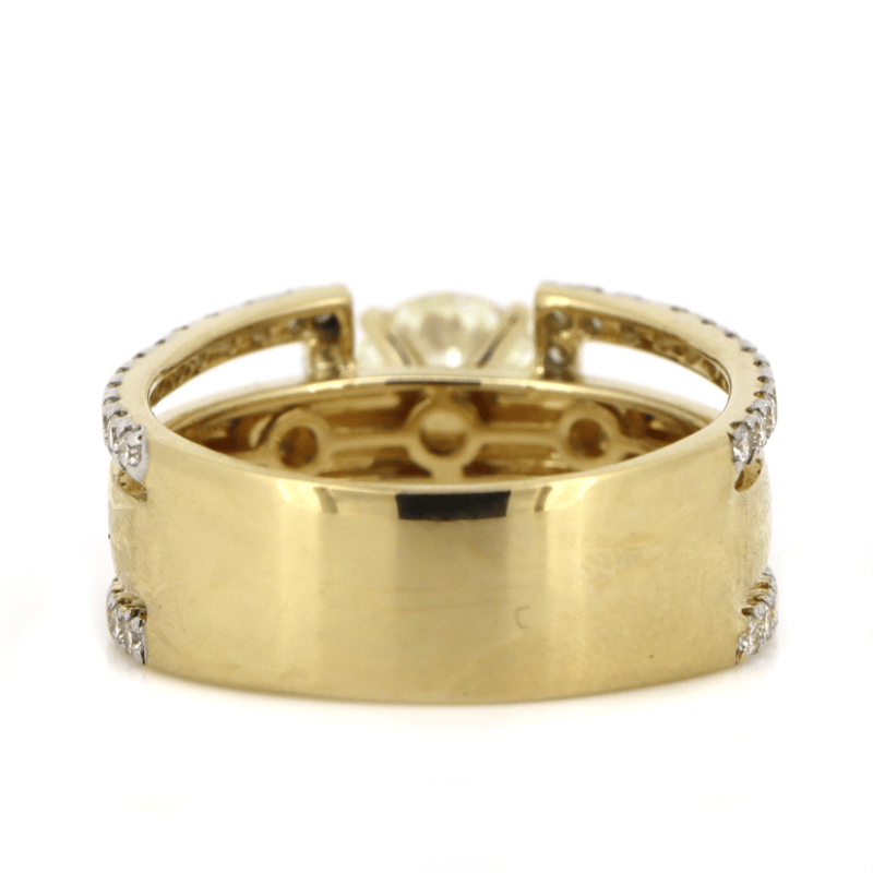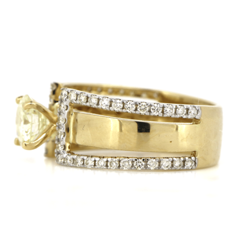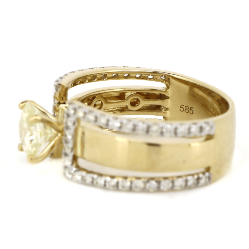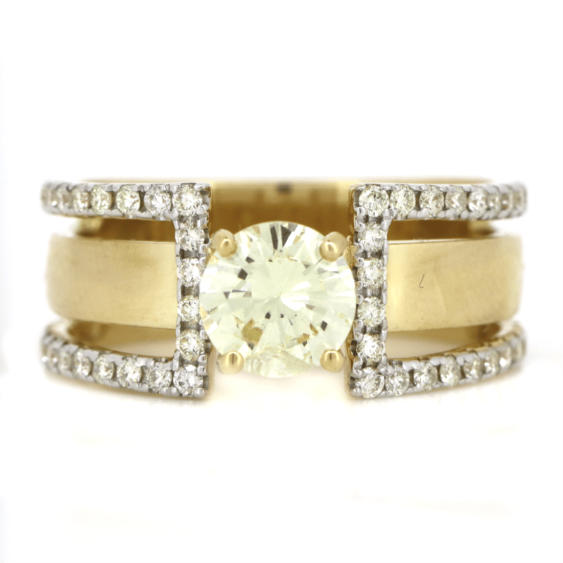 The Centre Features, One Round Brilliant Cut, Diamond (0.90Ct, L-M Colour, Si2 Clarity), 4 Claw Set In Yellow Gold. Embellishing The Design Are, 56 Round Brilliant Cut, Diamonds (0.48Ct Tdw, G-K Colour, Si-I2 Clarity), Micro Claw Set With Rhodium Plating. Ring Size M.