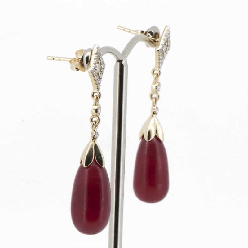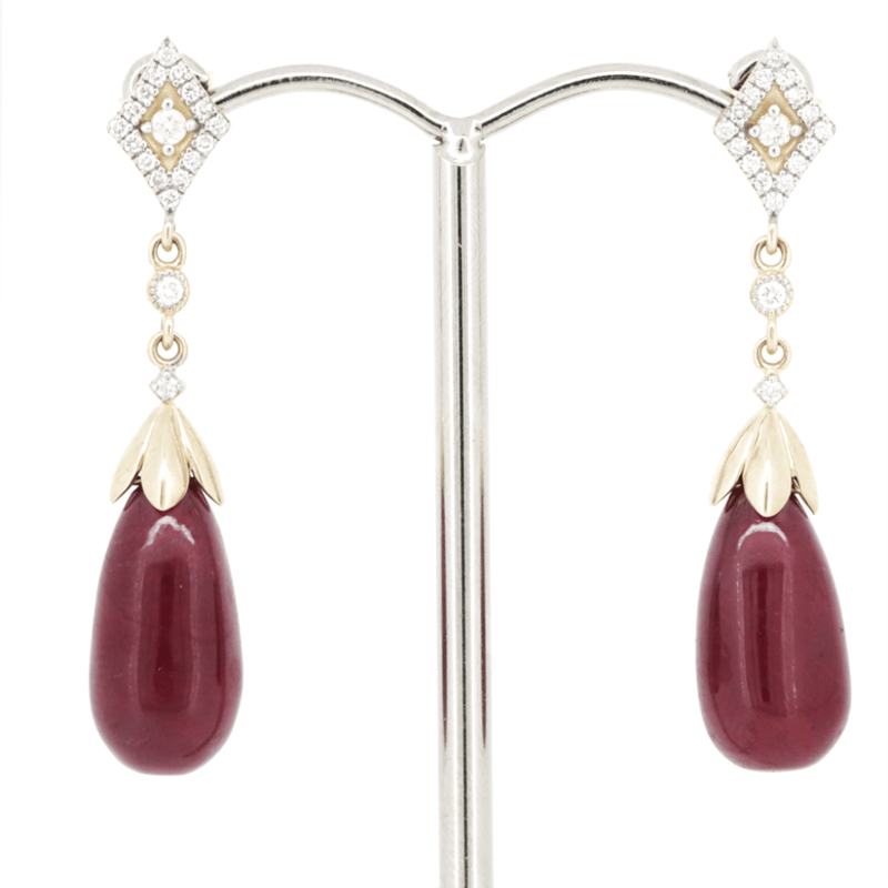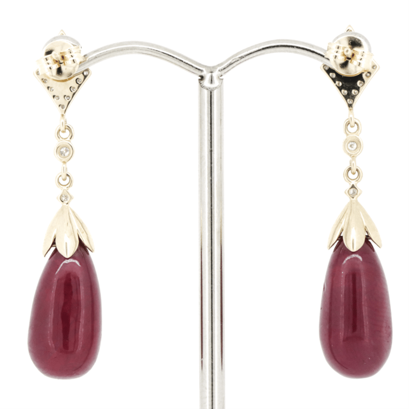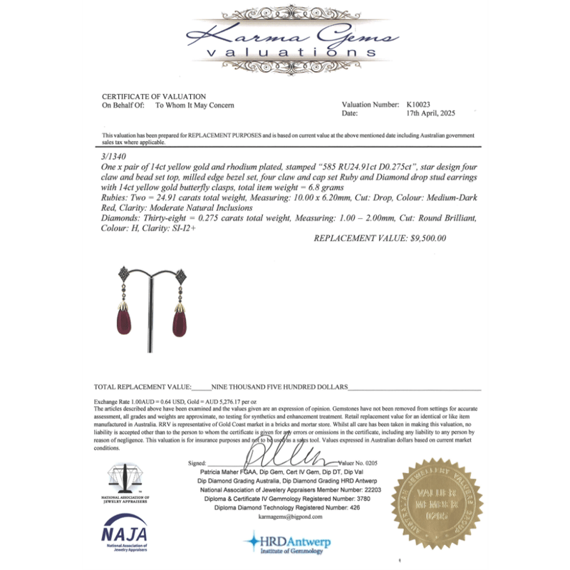 14K YELLOW GOLD, RUBY AND DIAMOND DROP EARRINGS. The Design Features, 2 Drop Cut, Medium-Dark, Rubies (24.91Ct Tsw, Moderate Natural Inclusions-Clarity), Cap Set. Encompassing The Design Are, 38 Round Brilliant Cut, Diamonds (0.27Ct Tdw, H Colour, Si-I2+ Clarity), Bead Set. The Earrings Have Have Post Backs, With 14K Yellow Gold Butterfly Clasps. Valuations Provided by an Independent Third-Party Professional Not Directly Associated With Lloyds Auctions at AUD $$9,500.00This valuation has been conducted by an independent third-party professional. The valuation amount is an assessment by the issuing valuer and does not reflect the auction value of the item. Any inquiries regarding the valuation should be directed to the issuing valuer (refer to contact details on the certificate), as Lloyds Auctions has no affiliation or influence over the valuation, the valuer, or the stated amount. Condition: Good - Refer Images 0645963+309