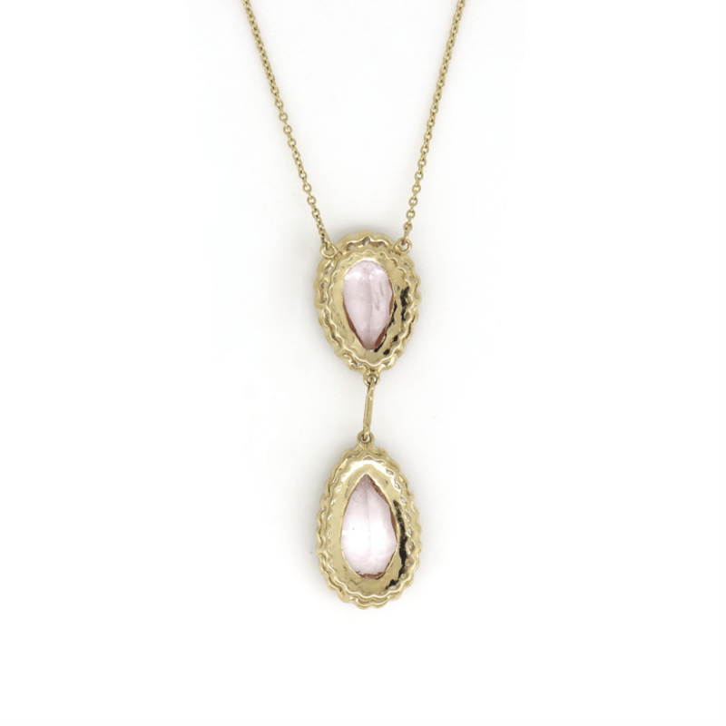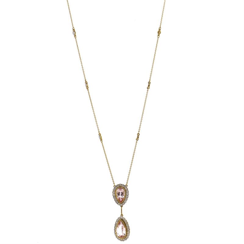 14K YELLOW GOLD, MORGANITE AND DIAMOND, DOUBLE DROP HALO NECKLACE.