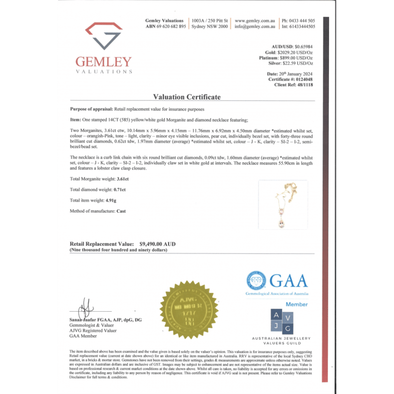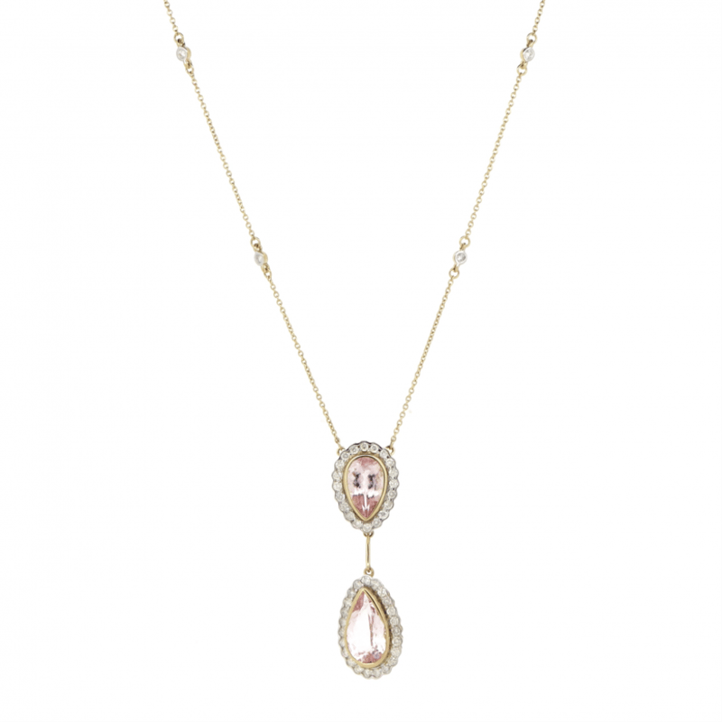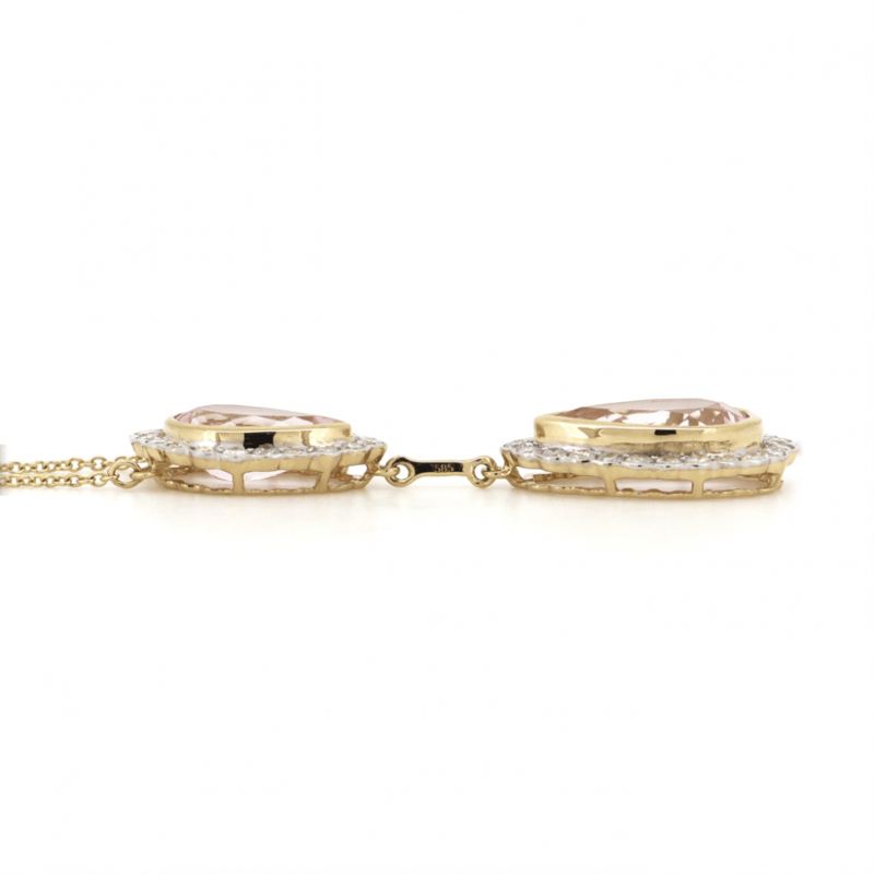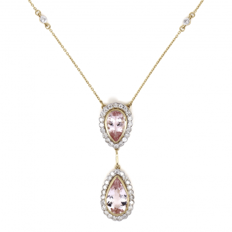 The Pendant Features, 2 Pear Cut, Light Orangish-Pink, Morganites (3.61Ct Tsw, Minor Eye Visible Inclusions), Bezel Set. Surrounding The Stones In Individual Halos Are, 43 Round Brilliant Cut, Diamonds (0.62Ct Tdw, J-K Colour, Si2-I2 Clarity), Semi-Bezel/Bead Set. Decorating The Chain Are, 6 Round Brilliant Cut, Diamonds (0.09Ct Tdw, J-K Colour, Si2-I2 Clarity), Bezel Set. The Necklace Has A Lobster Claw Clasp. Chain Length Is 55.9Cm.