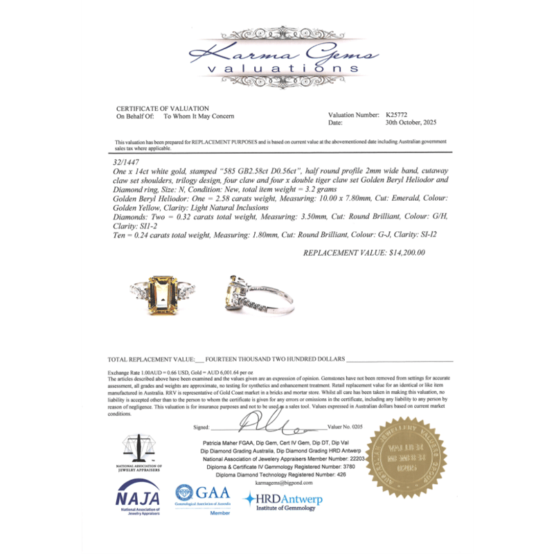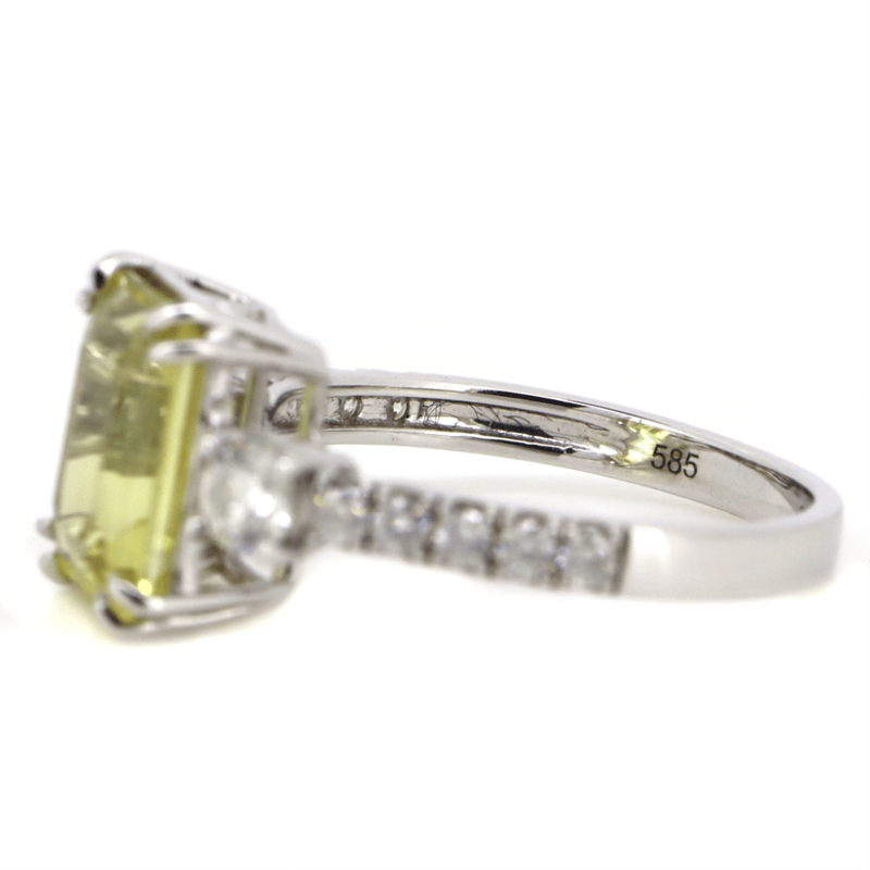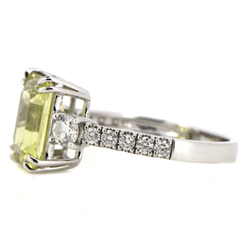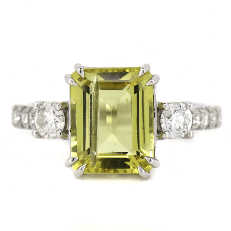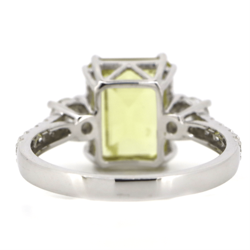 The Centre Features, One Emerald Cut, Heliodor (2.58Ct, Light Natural Inclusions), Claw Set. Flanking Either Side Of The Centre Are, 2 Round Brilliant Cut, Diamonds (0.32Ct Tdw, G-H Colour, Si1-2 Clarity), 4 Claw Set. Decorating The Band Are, 10 Round Brilliant Cut, Diamonds (0.24Ct Tdw, G-J Colour, Si-I2 Clarity), Claw/Bead Set Whit Rhodium Plating. Ring Size N.