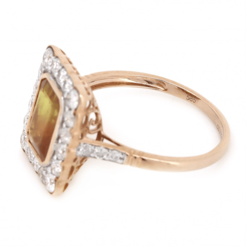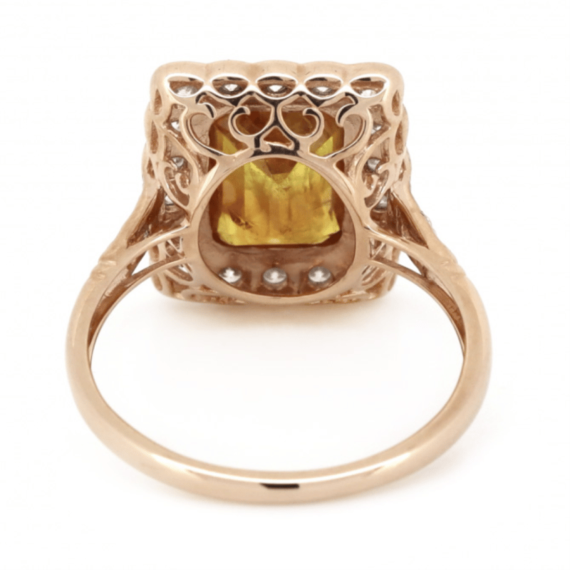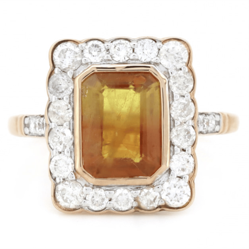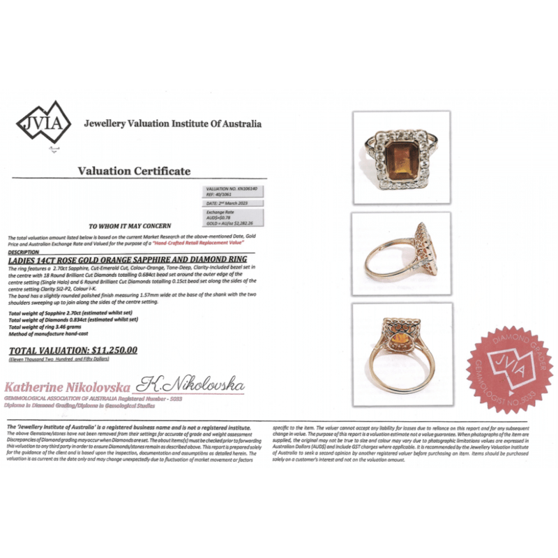 14K ROSE GOLD, ORANGE SAPPHIRE AND DIAMOND, HALO RING. The Centre Features, One Emerald Cut, Deep Orange, Sapphire (2.70Ct, Included), Bezel Set. Surrounding The Centre In A Halo And Decorating The Shoulders Are, 24 Round Brilliant Cut, Diamonds (0.834Ct Tdw, I-K Colour, Si2-P2 Clarity), Bead Set. Ring Size O. Valuations Provided by an Independent Third-Party Professional Not Directly Associated With Lloyds Auctions at AUD $$11,250.00This valuation has been conducted by an independent third-party professional. The valuation amount is an assessment by the issuing valuer and does not reflect the auction value of the item. Any inquiries regarding the valuation should be directed to the issuing valuer (refer to contact details on the certificate), as Lloyds Auctions has no affiliation or influence over the valuation, the valuer, or the stated amount. Condition: Good - Refer Images 0645963+316