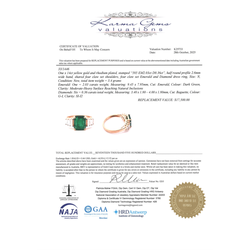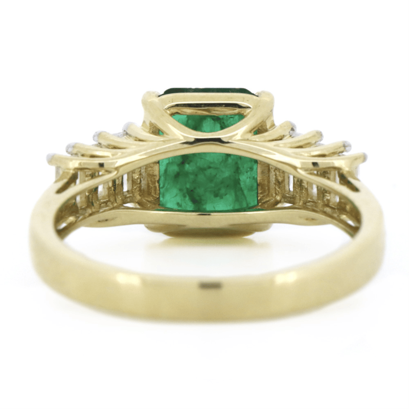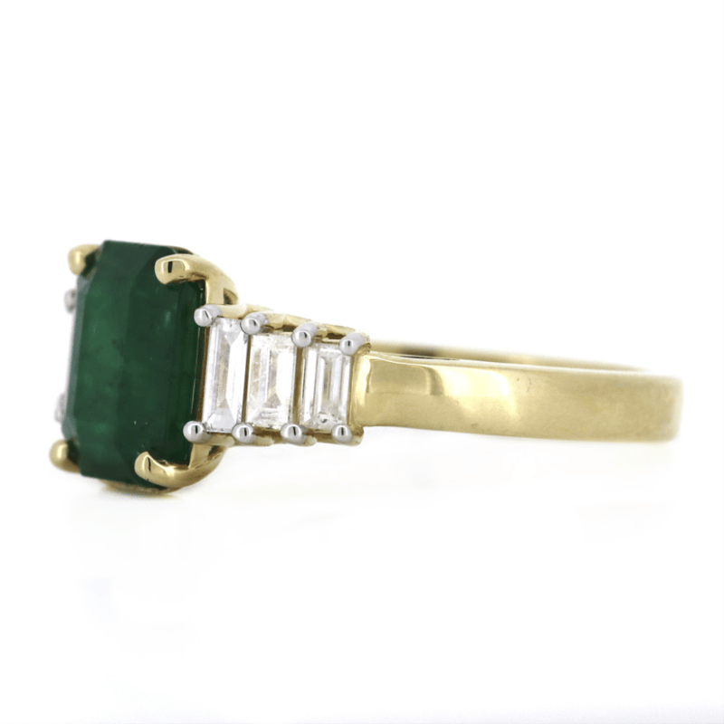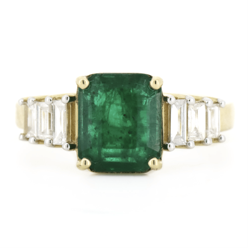 The Centre Features, One Emerald Cut, Dark Green, Emerald (2.03Ct, Moderate-Heavy Surface Reaching Inclusions), 4 Claw Set. Decorating The Band Are, 6 Baguette Cut, Diamonds (0.36Ct Tdw, G-I Colour, Si-I2 Clarity), Shared 4 Claw Set. Ring Size N.