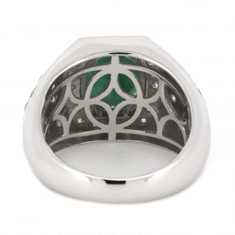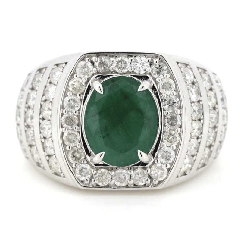 14K WHITE GOLD, EMERALD AND DIAMOND, GENTS RING.
