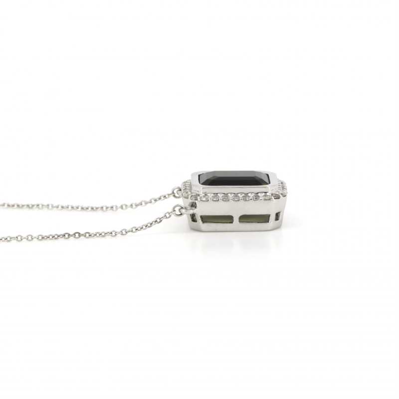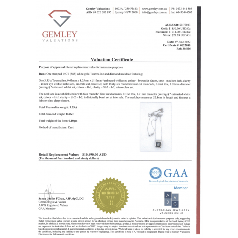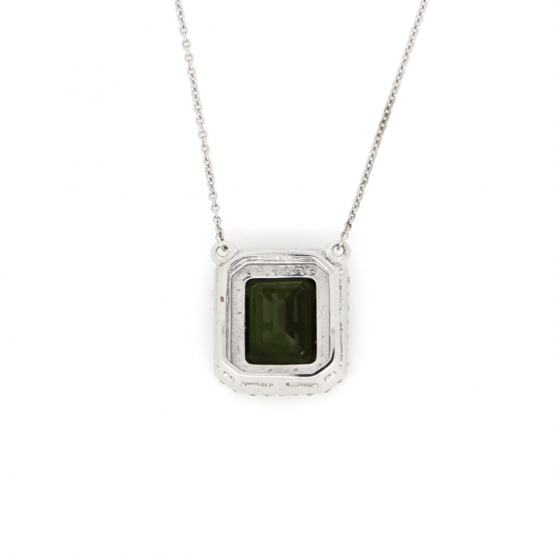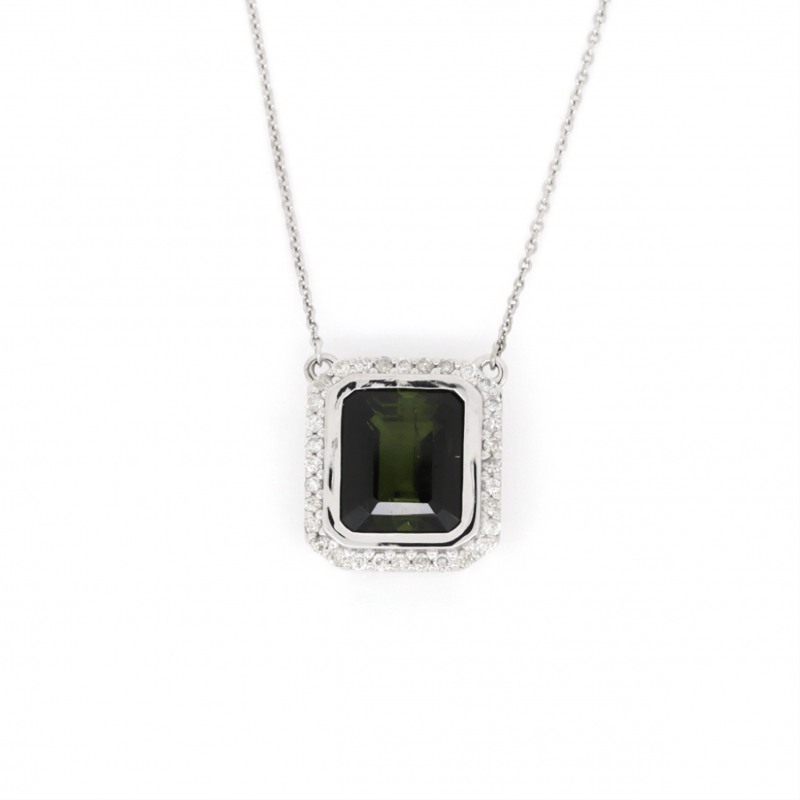 The Pendant Features, One Emerald Cut, Brownish-Green, Tourmaline (3.35Ct, Minor Eye Visible Inclusions), Bezel Set. Surrounding The Stone In A Halo And Decorating The Chain Are, 40 Round Brilliant Cut, Diamonds (0.36Ct Tdw, H-J Colour, Si2-I2 Clarity), Micro-Claw/Bezel Set. The Necklace Has A Lobster Claw Clasp. Chain Length Is 53Cm (Adjustable).