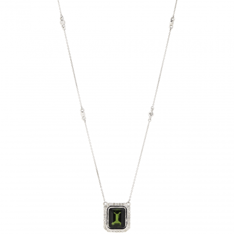 14K WHITE GOLD, GREEN TOURMALINE AND DIAMOND, HALO NECKLACE.