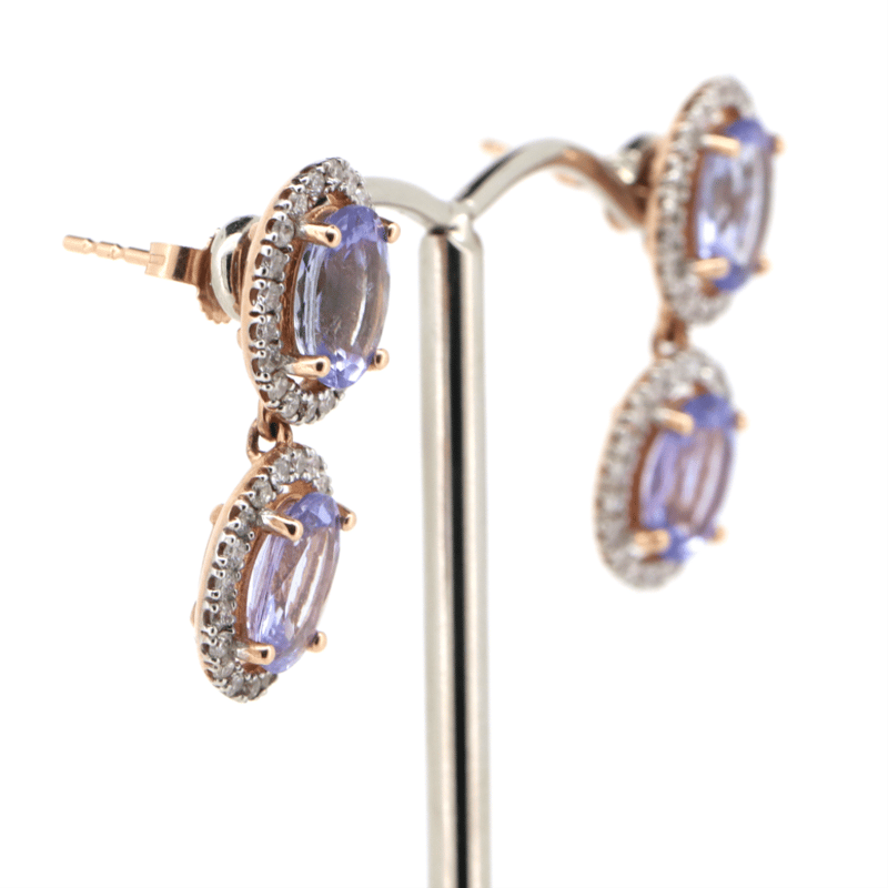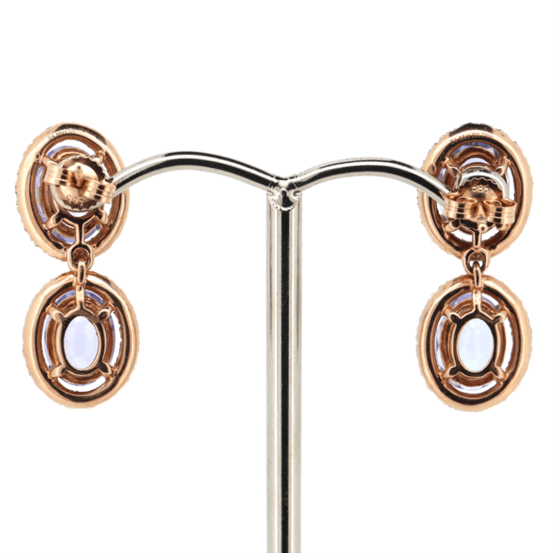 14K ROSE GOLD, TANZANITE AND DIAMOND, HALO DOUBLE DROP EARRINGS.