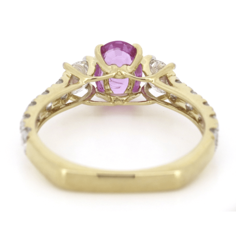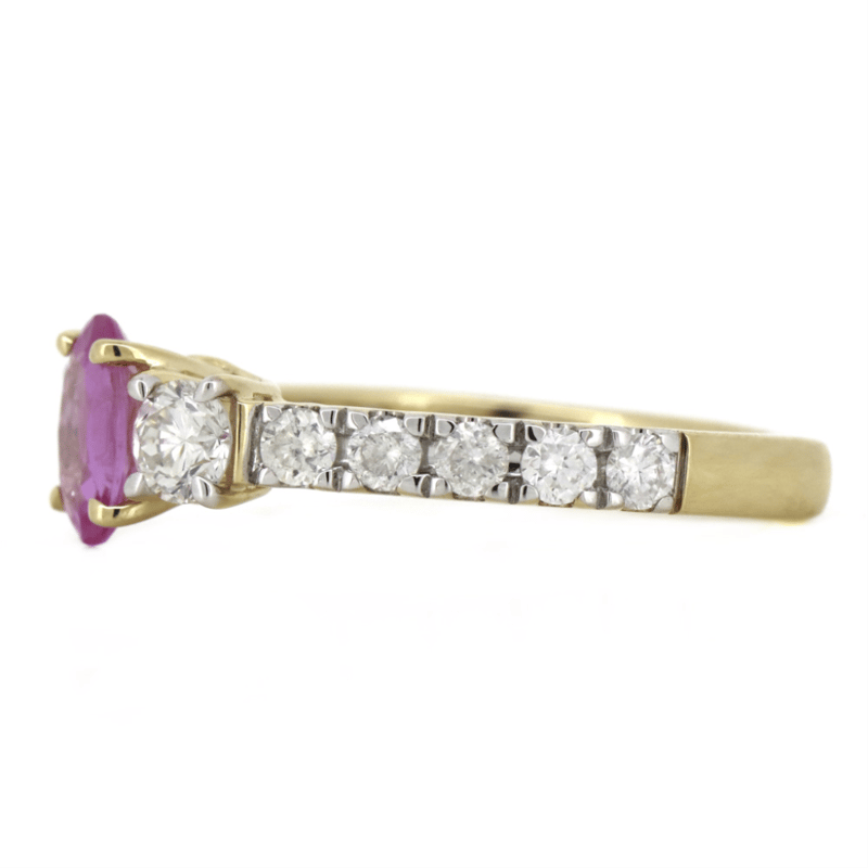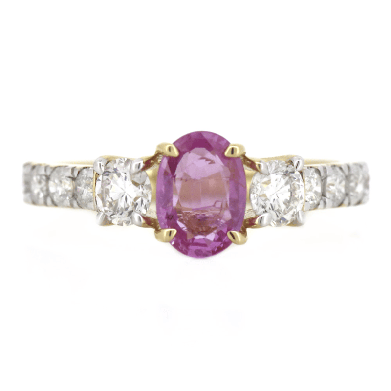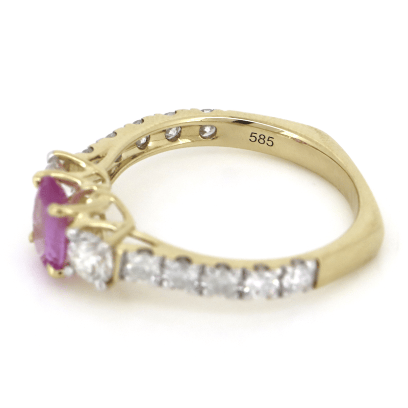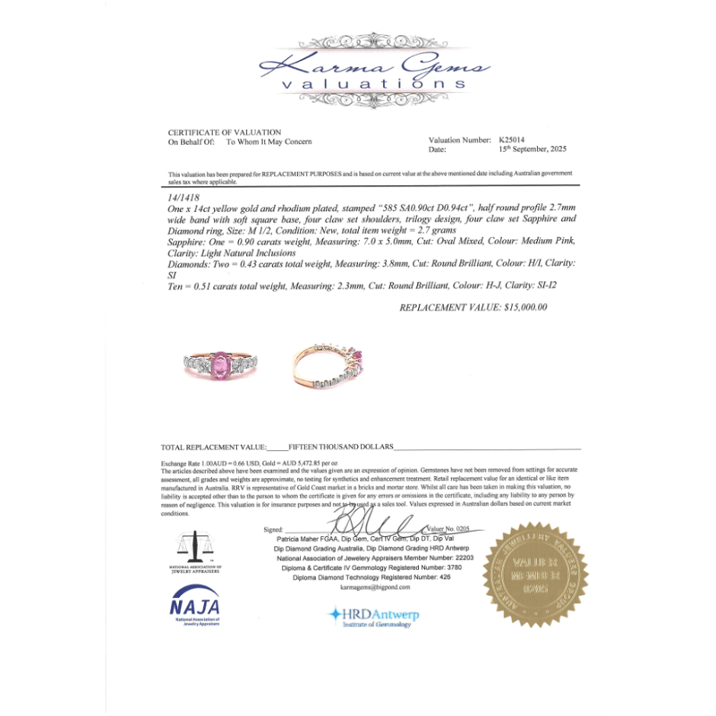 14K YELLOW GOLD, PINK SAPPHIRE AND DIAMOND, DRESS RING. The Centre Features, One Oval Cut, Medium Pink, Sapphire (0.90Ct, Natural Inclusions), Claw Set. Decorating The Shoulders Are, 2 Round Brilliant Cut, Diamonds (0.43Ct Tdw, H-I Colour, Si Clarity),4 Claw Set. Embellishing The Band Are, 10 Round Brilliant Cut, Diamonds (0.51Ct Tdw, H-J Colour, Si-I2 Clarity), Claw Set. Ring Size M 1/2. Valuations Provided by an Independent Third-Party Professional Not Directly Associated With Lloyds Auctions at AUD $$15,000.00This valuation has been conducted by an independent third-party professional. The valuation amount is an assessment by the issuing valuer and does not reflect the auction value of the item. Any inquiries regarding the valuation should be directed to the issuing valuer (refer to contact details on the certificate), as Lloyds Auctions has no affiliation or influence over the valuation, the valuer, or the stated amount. Condition: Good - Refer Images 0645963+335