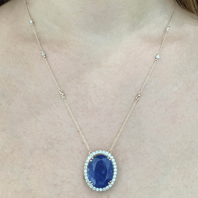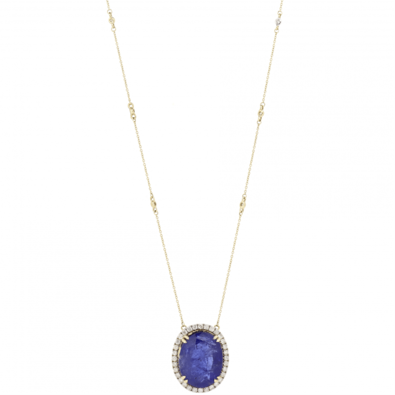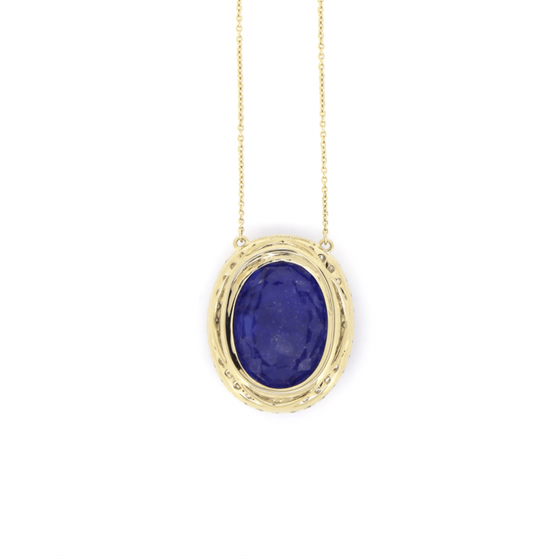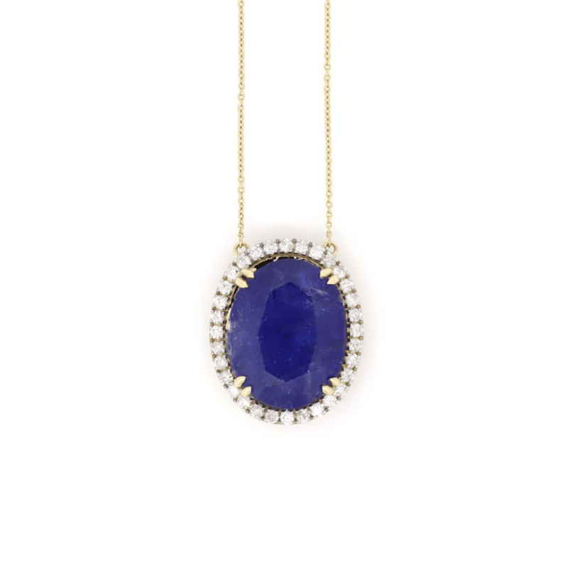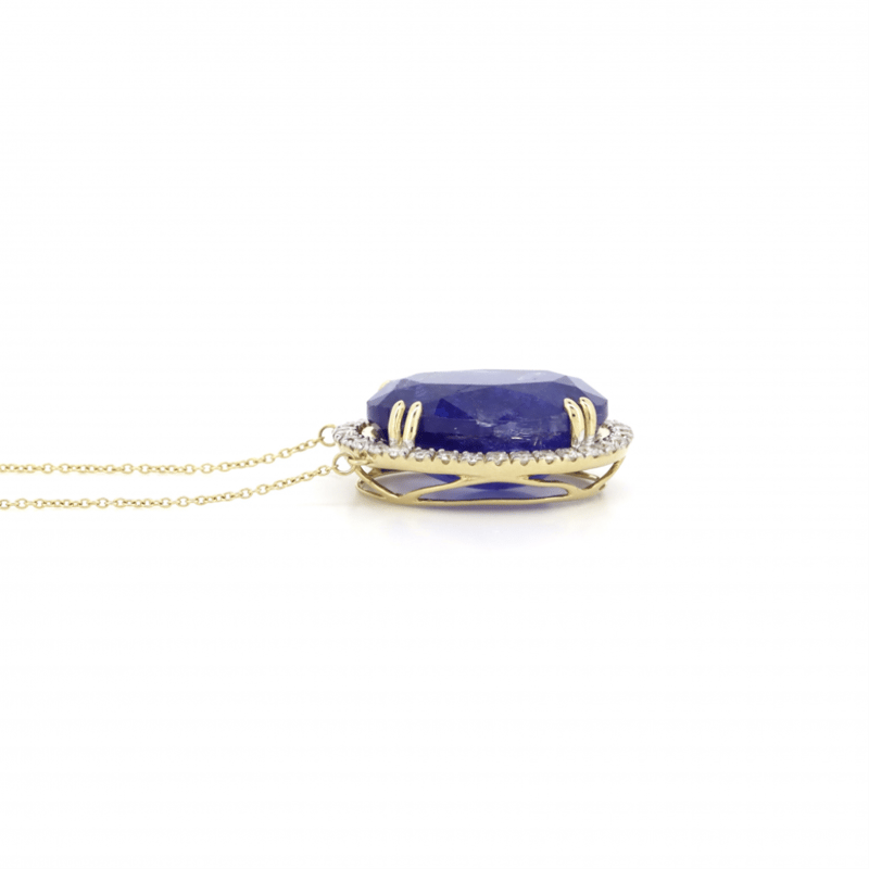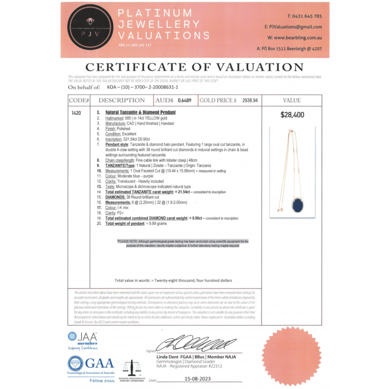 14K YELLOW GOLD, TANZANITE AND DIAMOND, HALO STATEMENT PENDANT NECKLACE. The Pendant Features, One Oval Faceted Cut, Moderate Blue-Purple, Tanzanite (21.54Ct, Heavily Included), Double 4 Claw Set. Surrounding The Tanzanite In A Halo And Decorating The Chain Are, 38 Round Brilliant Cut, Diamonds (0.90Ct Tdw, I-K Colour, P2+ Clarity), Claw/Bezel Set. The Necklace Has A Lobster Claw Clasp. Chain Length Is 49.5Cm. The Tanzanite Has Natural Inclusions That Have Reached The Surface On The Edges. Valuations Provided by an Independent Third-Party Professional Not Directly Associated With Lloyds Auctions at AUD $$28,400.00This valuation has been conducted by an independent third-party professional. The valuation amount is an assessment by the issuing valuer and does not reflect the auction value of the item. Any inquiries regarding the valuation should be directed to the issuing valuer (refer to contact details on the certificate), as Lloyds Auctions has no affiliation or influence over the valuation, the valuer, or the stated amount. Condition: Good - Refer Images 0645963+339