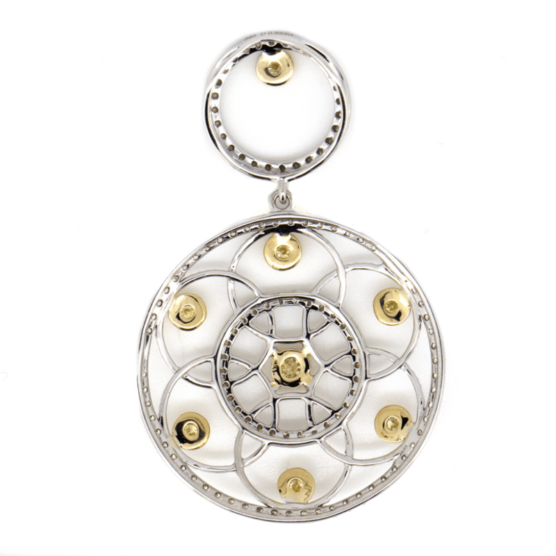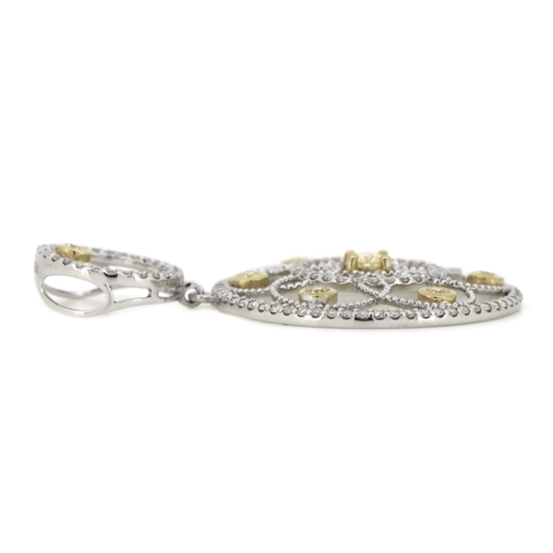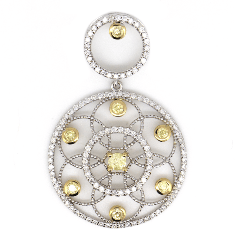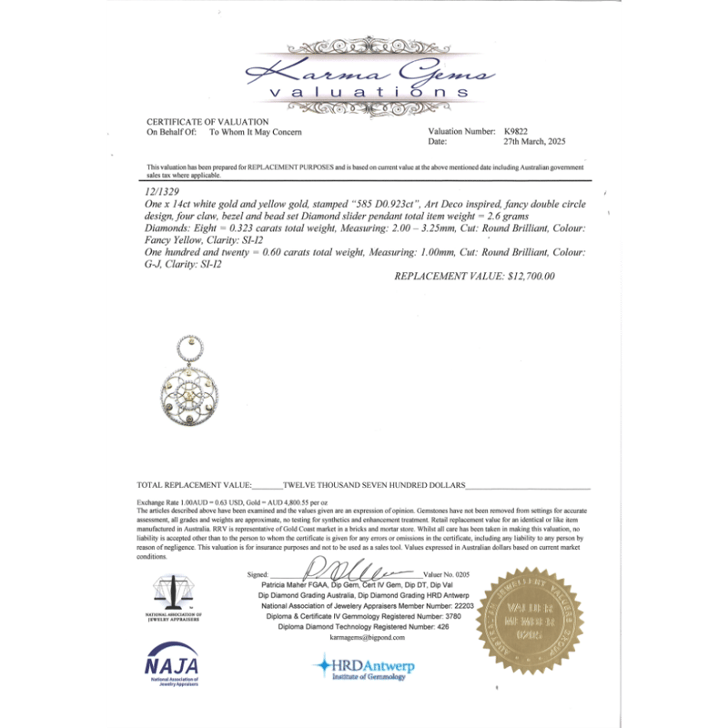 14K WHITE/YELLOW GOLD, FANCY YELLOW DIAMOND AND DIAMOND, ART DECO INSPIRED PENDANT. The Design Features 8 Round Brilliant Cut, Fancy Yellow Diamonds (0.323 Tdw, Si-I2 Clarity), 4 Claw/Bezel Set In Yellow Gold. Encompassing The Design Are, 120 Round Brilliant Cut, Diamonds (0.60 Tdw, G-J Colour, Si-I2 Clarity), Bead Set In White Gold. Valuations Provided by an Independent Third-Party Professional Not Directly Associated With Lloyds Auctions at AUD $$13,500.00This valuation has been conducted by an independent third-party professional. The valuation amount is an assessment by the issuing valuer and does not reflect the auction value of the item. Any inquiries regarding the valuation should be directed to the issuing valuer (refer to contact details on the certificate), as Lloyds Auctions has no affiliation or influence over the valuation, the valuer, or the stated amount. Condition: Good - Refer Images 0645963+344