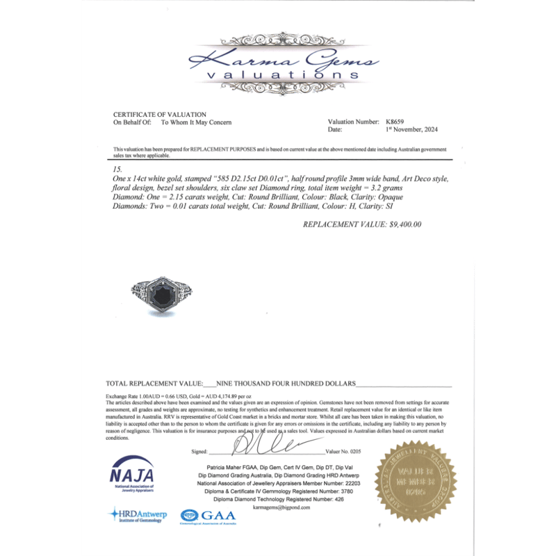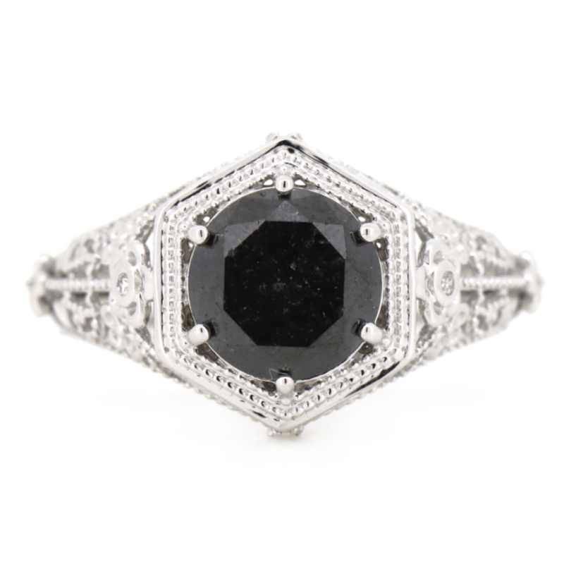 The Centre Features, One Round Brilliant Cut, Black, Diamond (2.15Ct, Opaque), 6 Claw Set. Decorating The Shoulders Are, 2 Round Brilliant Cut, Diamonds (0.01Ct Tdw, H Colour, Si Clarity), Bezel Set. The Band Is Decorated With Elaborate Floral Designs. Ring Size M.