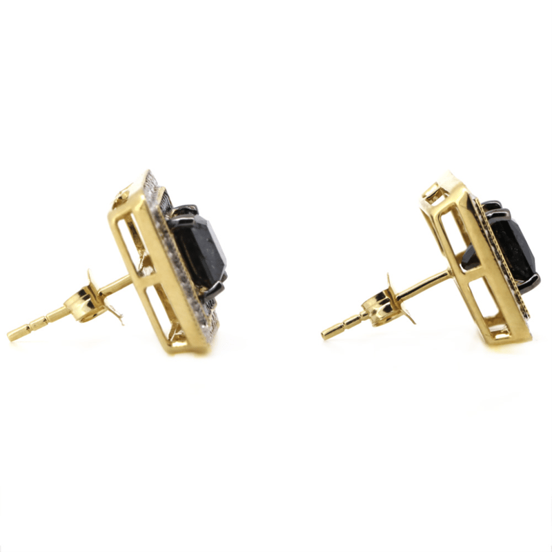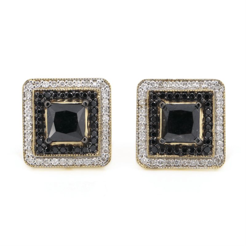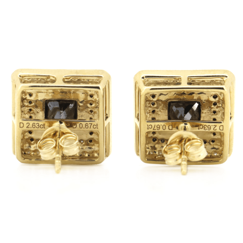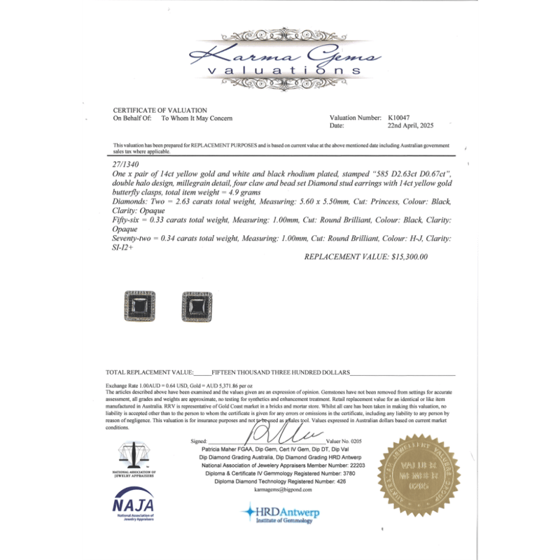 14K YELLOW GOLD, BLACK DIAMOND AND DIAMOND, DOUBLE HALO STUD EARRINGS. The Centres Feature, 2 Princess Cut, Black, Diamonds (2.63Ct Tdw, Opaque), 4 Claw Basket Set. Surrounding The Centre In The Innermost Halo Are, 56 Round Brilliant Cut, Black, Diamonds (0.33Ct Tdw, Opaque), Bead Set. Surrounding The Centre In The Outermost Halo Are, 72 Round Brilliant Cut, Diamonds (0.34Ct Tdw, H-J Colour, Si1-I2+ Clarity), Bead Set. Valuations Provided by an Independent Third-Party Professional Not Directly Associated With Lloyds Auctions at AUD $$15,300.00This valuation has been conducted by an independent third-party professional. The valuation amount is an assessment by the issuing valuer and does not reflect the auction value of the item. Any inquiries regarding the valuation should be directed to the issuing valuer (refer to contact details on the certificate), as Lloyds Auctions has no affiliation or influence over the valuation, the valuer, or the stated amount. Condition: Fair - Refer To Images 0645963+349