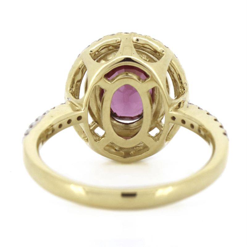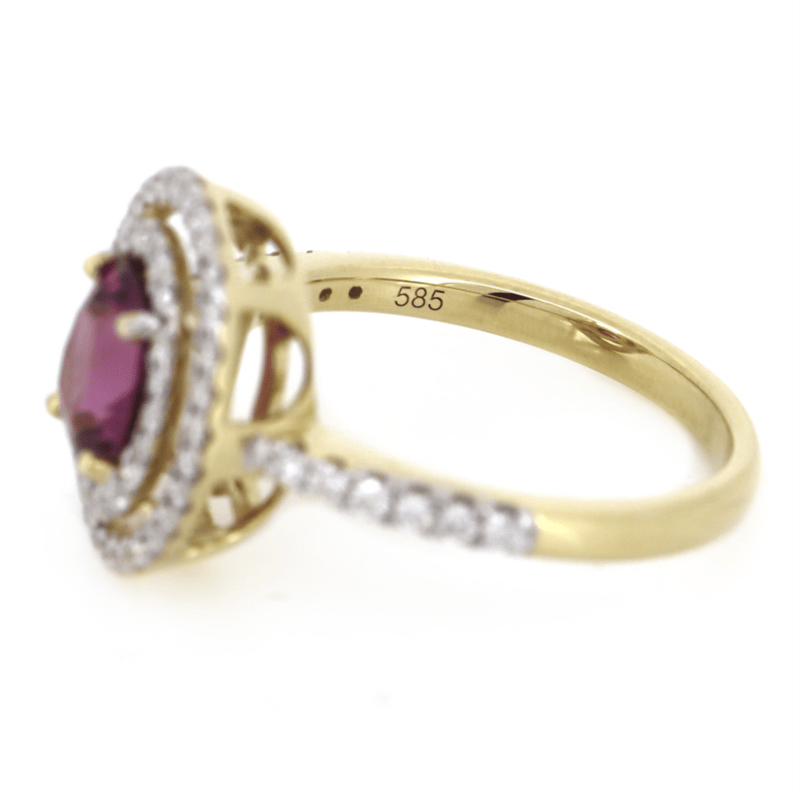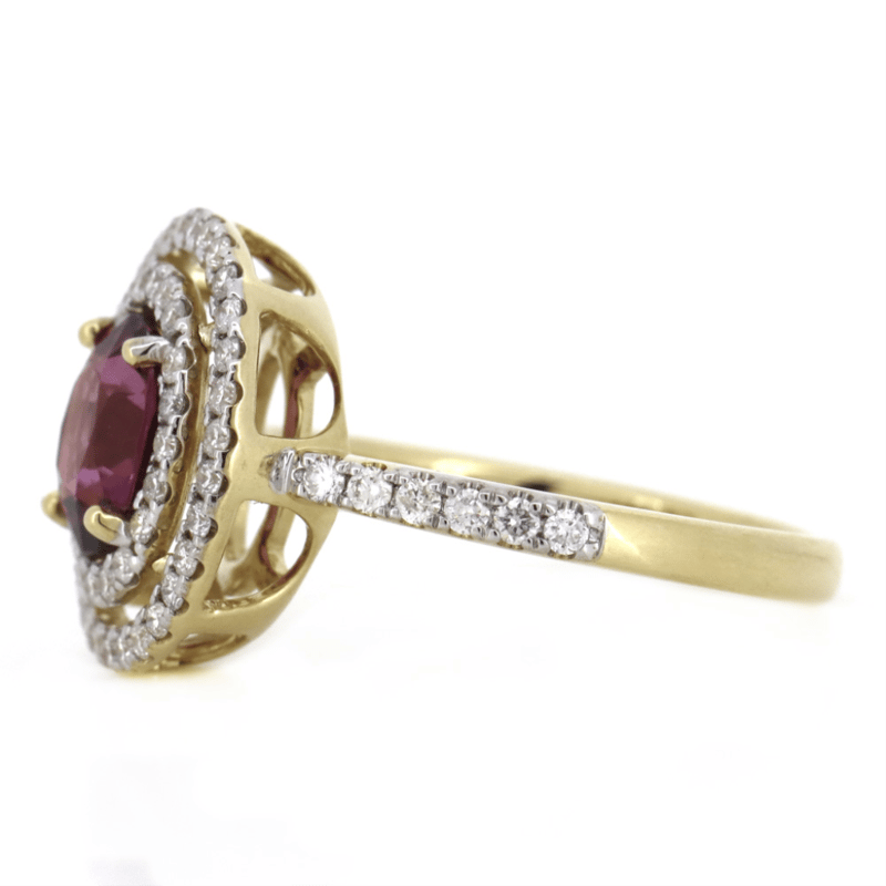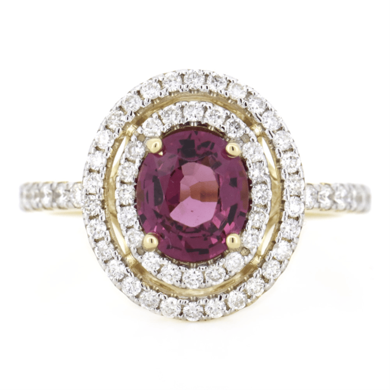 14K YELLOW GOLD, RHODOLITE GARNET AND DIAMOND, DOUBLE HALO RING. The Centre Features, One Oval Cut, Pinkish-Purple, Rhodolite Garnet (1.38Ct, Eye Clean Clarity), 4 Claw Set. Surrounding The Centre In A Double Halo And Decorating The Band Are, 62 Round Brilliant Cut, Diamonds (0.49Ct Tdw, H-I Colour, Si-I2 Clarity), Micro-Claw Set In Yellow Gold. Ring Size M. Valuations Provided by an Independent Third-Party Professional Not Directly Associated With Lloyds Auctions at AUD $$14,600.00This valuation has been conducted by an independent third-party professional. The valuation amount is an assessment by the issuing valuer and does not reflect the auction value of the item. Any inquiries regarding the valuation should be directed to the issuing valuer (refer to contact details on the certificate), as Lloyds Auctions has no affiliation or influence over the valuation, the valuer, or the stated amount. Condition: Good - Refer Images 0645967+7