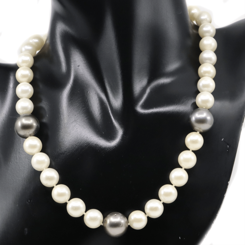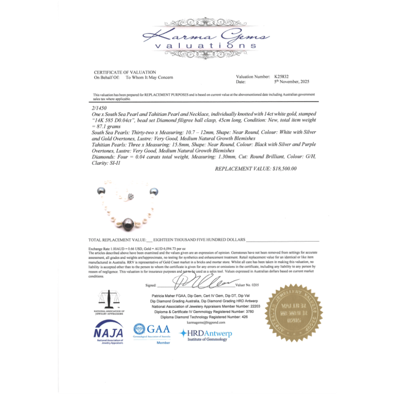 14K WHITE GOLD, BLACK TAHITIAN AND WHITE CULTURED SOUTH SEA PEARL AND DIAMOND, STRAND NECKLACE. The Design Features, 3 Near Round, Black Tahitian Pearls (15.8Mm, Very Good Lustre, Natural Growth Blemishes), And 32 Cultured White South Sea Pearls, With Silver And Gold Overtones (10.7Mm - 12Mm Size, Very Good Lustre, Medium Natural Growth Blemishes), Strung In A Single Row, Graduating In Size. Embellishing The 14K White Gold Filigree Ball Clasp Are, 4 Round Brilliant Cut, Diamonds (0.04Ct Tdw, G-H Colour, Si-I1 Clarity), Bead Set. Necklace Length Is 45Cm. Valuations Provided by an Independent Third-Party Professional Not Directly Associated With Lloyds Auctions at AUD $$18,500.00This valuation has been conducted by an independent third-party professional. The valuation amount is an assessment by the issuing valuer and does not reflect the auction value of the item. Any inquiries regarding the valuation should be directed to the issuing valuer (refer to contact details on the certificate), as Lloyds Auctions has no affiliation or influence over the valuation, the valuer, or the stated amount. Condition: Good - Refer Images 0645967+11