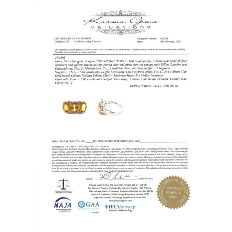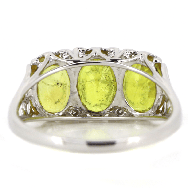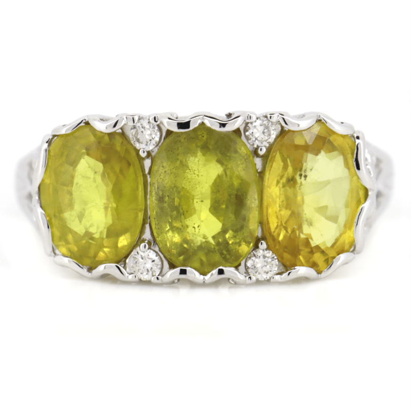 The Centre Features, 3 Oval Cut, Yellow Sapphires (5.04Ct Tsw, Moderate-Heavy Eye Visible Inclusions), Bezel Set. Decorating The Design Are, 4 Round Brilliant Cut, Diamonds (0.08Ct Tdw, G-H Colour, Si1-2 Clarity), Claw Set. Ring Size Q.