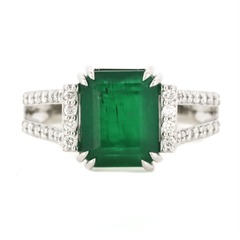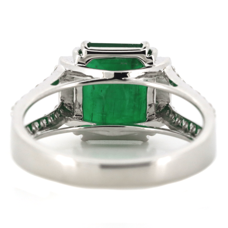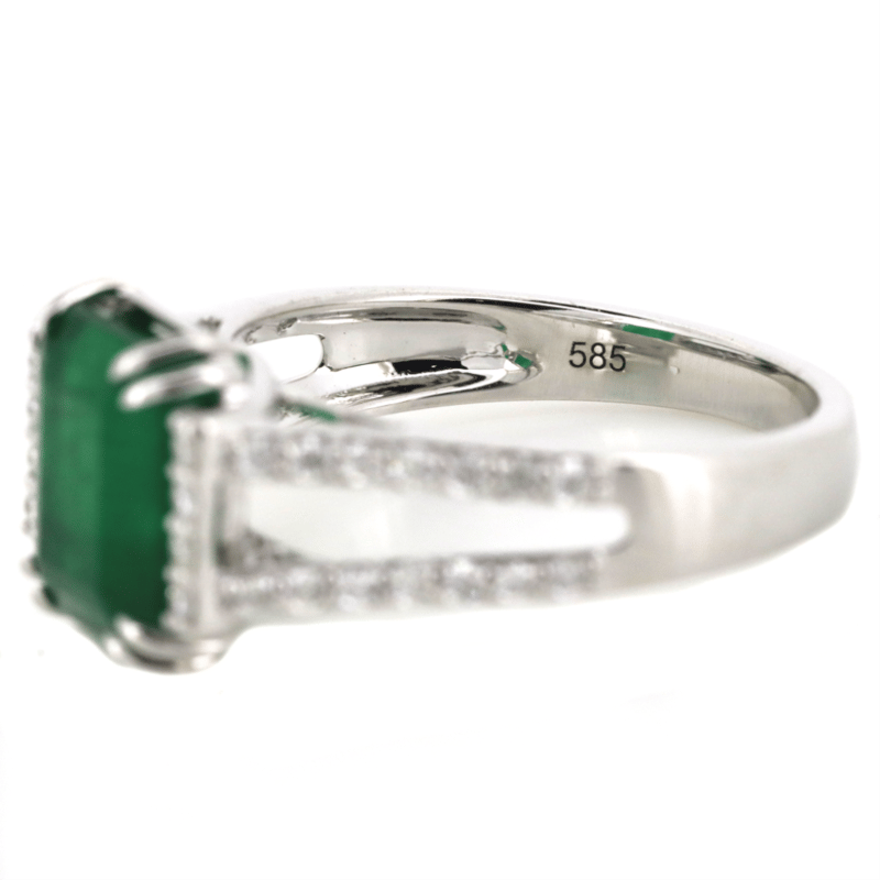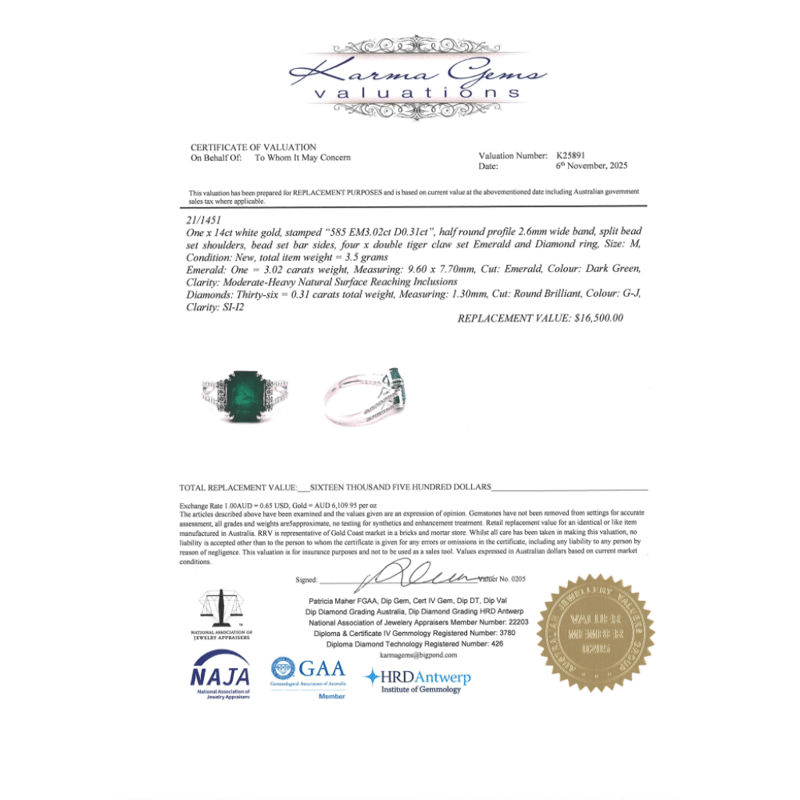 14K WHITE GOLD, EMERALD AND DIAMOND, DRESS RING. The Centre Features, One Emerald Cut, Emerald (3.02Ct, Moderate-Heavy Inclusions), Double 4 Claw Set. Embellishing The Design Are, 36 Round Brilliant Cut, Diamonds (0.31Ct Tdw, G-J Colour, Si-I2 Clarity), Micro-Bead Set In White Gold. Ring Size M. Valuations Provided by an Independent Third-Party Professional Not Directly Associated With Lloyds Auctions at AUD $$16,500.00This valuation has been conducted by an independent third-party professional. The valuation amount is an assessment by the issuing valuer and does not reflect the auction value of the item. Any inquiries regarding the valuation should be directed to the issuing valuer (refer to contact details on the certificate), as Lloyds Auctions has no affiliation or influence over the valuation, the valuer, or the stated amount. Condition: Good - Refer Images 0645967+16