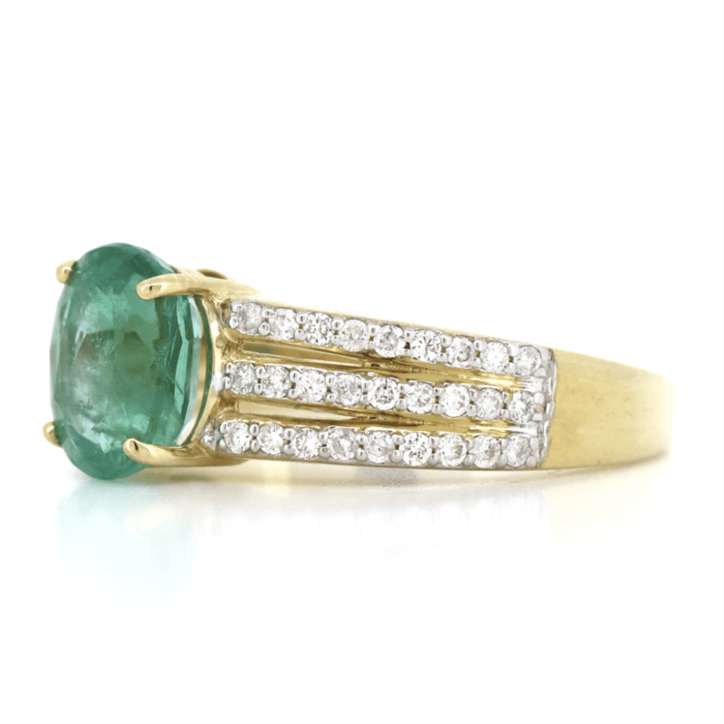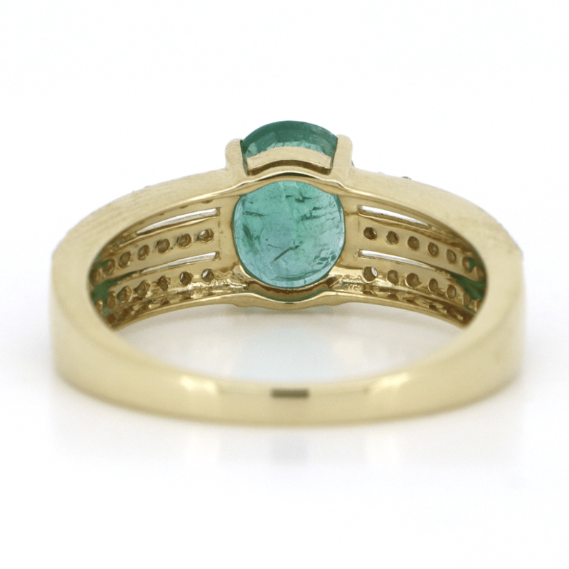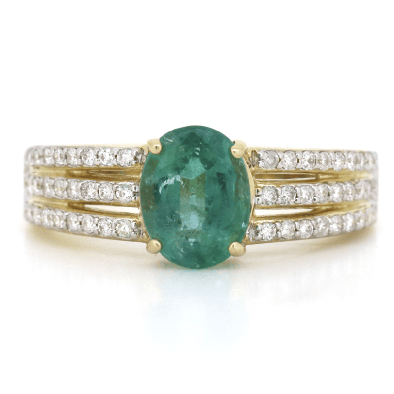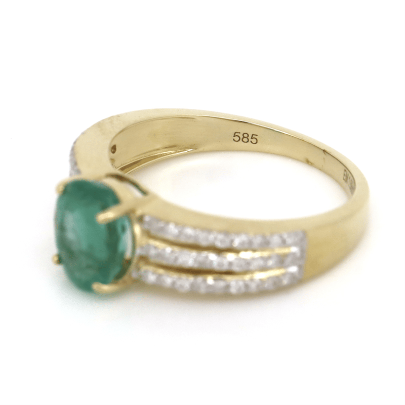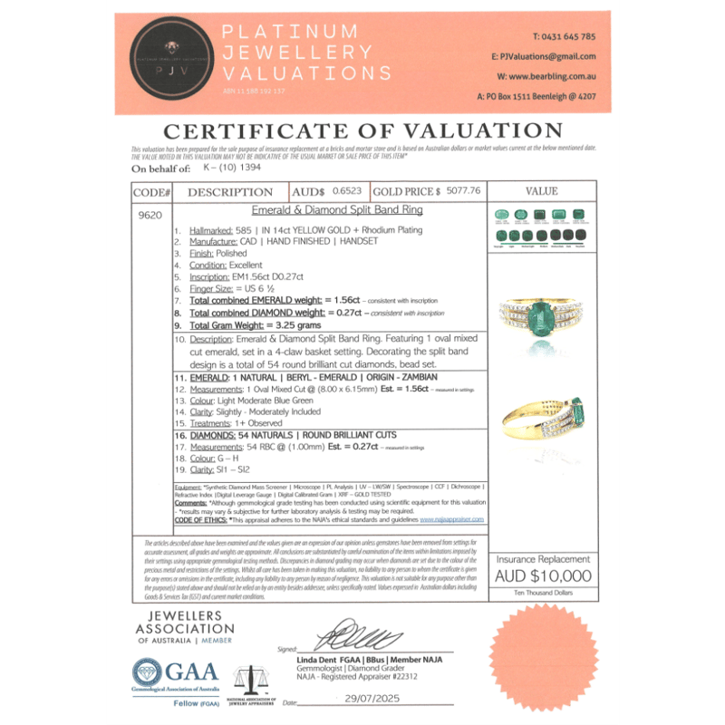 14K YELLOW GOLD, 1.56CT ZAMBIAN EMERALD AND DIAMOND, SPLIT BAND RING. The Centre Features, One Oval Cut, Zambian Emerald (1.56Ct, Moderate Inclusions), 4 Claw Set. Decorating The Split Band Design Are, 54 Round Brilliant Cut, Diamonds (0.27Ct Tdw, G-H Colour, Si1-Si2 Clarity), Bead Set. Ring Size M 1/2. Valuations Provided by an Independent Third-Party Professional Not Directly Associated With Lloyds Auctions at AUD $$10,000.00This valuation has been conducted by an independent third-party professional. The valuation amount is an assessment by the issuing valuer and does not reflect the auction value of the item. Any inquiries regarding the valuation should be directed to the issuing valuer (refer to contact details on the certificate), as Lloyds Auctions has no affiliation or influence over the valuation, the valuer, or the stated amount. Condition: Good - Refer Images 0645967+17